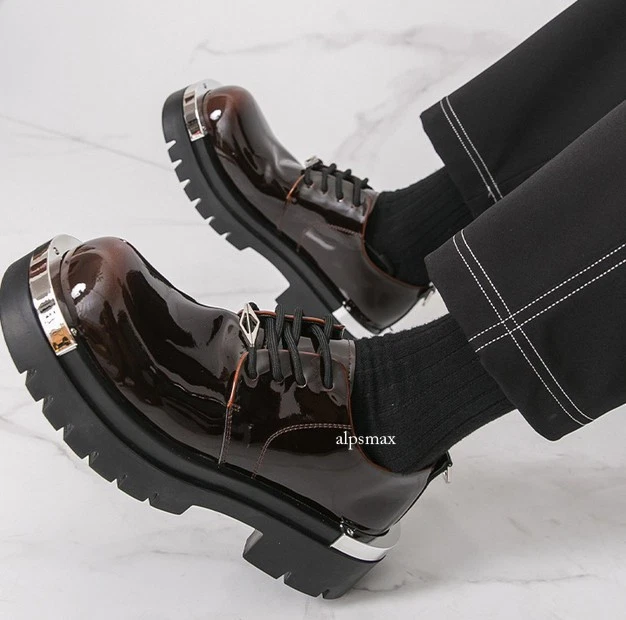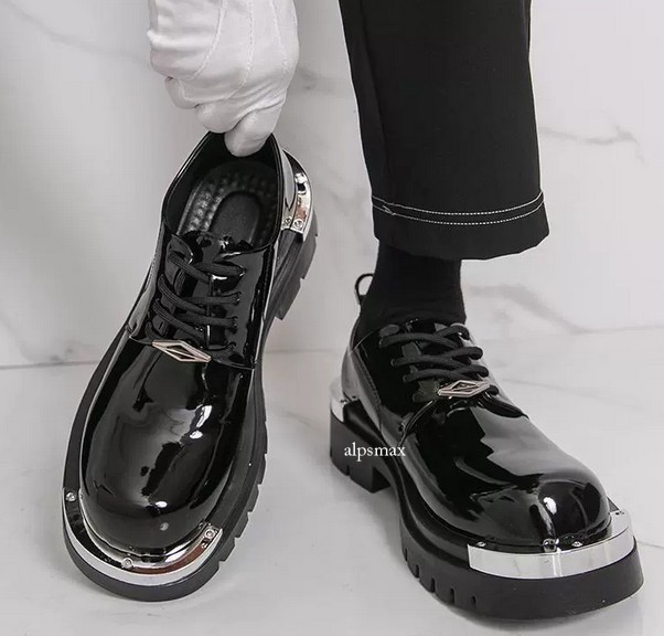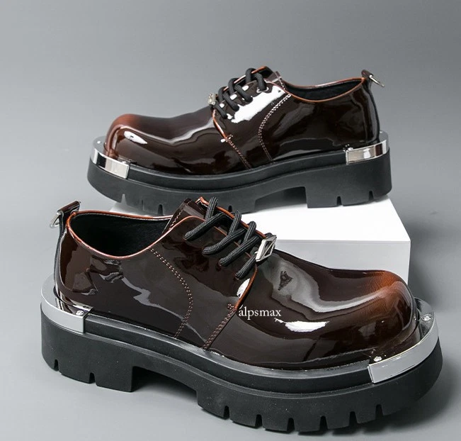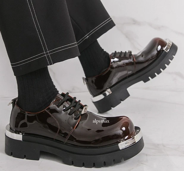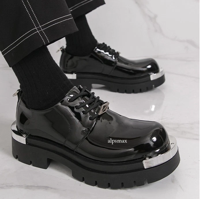 Men's Shiny Leather Thick Sole Metal Big Round Toe Derby Leather Platform Shoes