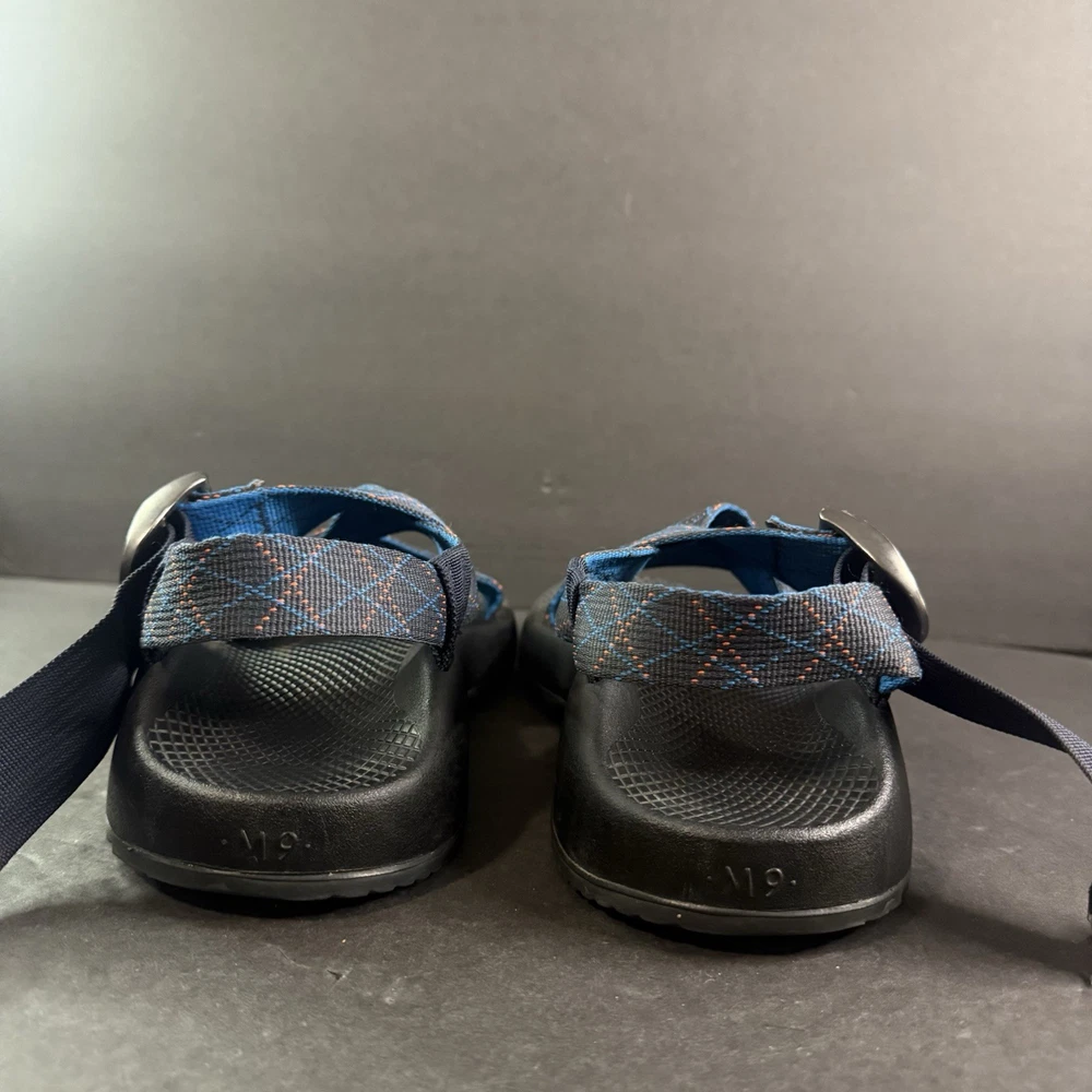 The product is a pair of Men’s Chaco adjustable sandals in size 9, featuring a blue and orange pattern. These sporty casual sandals are designed for hiking and other outdoor activities, with an adjustable fit for added comfort. The synthetic upper material and slip-on style make them durable and easy to wear for various occasions. Ideal for men who enjoy blending style and functionality in their footwear.