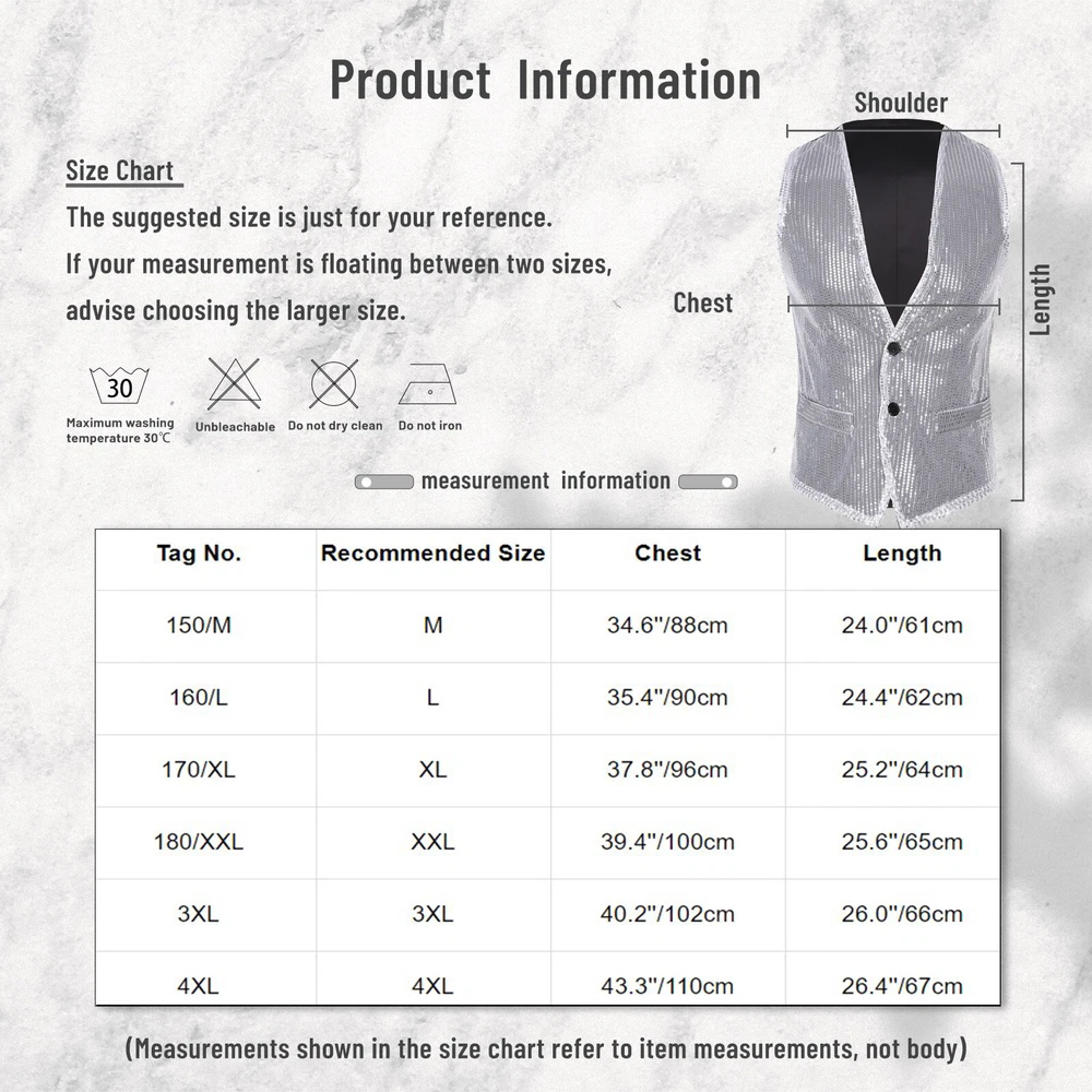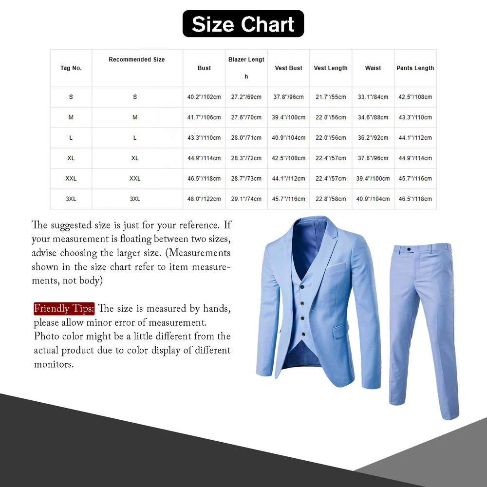 Click Here to New Arrivals New Arrivals Hot Sale Women's Dresses Women's Swimsuit Girls'Dresses Girls'Sleepwear Girls'Swimwear Boys'Clothing Baby Clothing Men 3-Piece Suit Blazer Slim Fit Tuxedo with One Button Jacket Vest Pants Set Set Include : 1Pc Blazer, 1Pc Vest, 1Pc Pants Condition : New Without Tag Material : 50% Cotton, 50% Polyester Features : 3pcs men pure color gentleman outfit set long sleeve one-button blazer fully-lined vest long pants suit for office wedding. Made of high quality cotton and polyester fabric, skin-friendly, does not irritate your skin, no itch. One-button closure, long sleeve, notch lapel, chest pocket and flap pockets, fully-lined button-down vest and pants. Perfect to pair them with solid color shirts in different colors, chic ties, and leather shoes. Suitable for party, cocktail, office, meetings, daily wear, work, other formal and casual occasions. Size Chart The suggested size is just for your reference. If your measurement is floating between two sizes, advise choosing the larger size. (Measurements shown in the size chart refer to item measurements, not body) Tag No. Recommended Size Bust Blazer Length Vest Bust Vest Length Waist Pants Length S S 40.2’’/102cm 27.2’’/69cm 37.8’’/96cm 21.7’’/55cm 33.1’’/84cm 42.5’’/108cm M M 41.7’’/106cm 27.6’’/70cm 39.4’’/100cm 22.0’’/56cm 34.6’’/88cm 43.3’’/110cm L L 43.3’’/110cm 28.0’’/71cm 40.9’’/104cm 22.0’’/56cm 36.2’’/92cm 44.1’’/112cm XL XL 44.9’’/114cm 28.3’’/72cm 42.5’’/108cm 22.4’’/57cm 37.8’’/96cm 44.9’’/114cm XXL XXL 46.5’’/118cm 28.7’’/73cm 44.1’’/112cm 22.4’’/57cm 39.4’’/100cm 45.7’’/116cm 3XL 3XL 48.0’’/122cm 29.1’’/74cm 45.7’’/116cm 22.8’’/58cm 40.9’’/104cm 46.5’’/118cm Friendly Tips: The size is measured by hands, please allow minor error of measurement. Photo color might be a little different from the actual product due to color display of different monitors. #2 Set Include : 1Pc Vest Condition : Brand New Material : 20% Cotton, 80% Polyester Features : Mens utility multi-pocket design v neck zip-up loose cargo vest for fishing climbing photo outdoor work. Made of high quality cotton and polyester fabric, wear resistance, not easy to deform or tear, skin-friendly and lightweight. V neck and zip-up front, solid color, utility multi-pockets design that totally 8 pockets, adjustable straps on the sides of waist. Loose and lightweight design can wear on easily no matter how many clothes you have worn, and no more burden for you. Suitable for fishing, climbing, safari, hiking, cycling, photography, volunteers, journalists or other outdoor work. Size Chart The suggested size is just for your reference. If your measurement is floating between two sizes, advise choosing the larger size. (Measurements shown in the size chart refer to item measurements, not body) Tag No. Recommended Size Chest Length XL XL 43.3’’/110cm 24.4’’/62cm XXL XXL 44.1’’/112cm 25.2’’/64cm 3XL 3XL 45.7’’/116cm 26.0’’/66cm 4XL 4XL 50.4’’/128cm 26.8’’/68cm Friendly Tips: The size is measured by hands, please allow minor error of measurement. Photo color might be a little different from the actual product due to color display of different monitors. Vest #2 Set Include : 1x Waistcoat Condition : New without tag Material : 90% Polyester, 10% Spandex Features : Made of High quality fabric, soft, breathable, skin-friendly, comfy to touch and wear, makes you feeling well. V-neck vest for men and women, sleeveless, front with glittery sequin, make you eye-catching in the crowd. Designed with 2 fake pockets for decoration, asymmetrical hem. 2 buttons closure, easy to put on and take off. You can wear this shiny sequined vest pair with shirt, blouse, jeans, suit pants or sequined pants for a fashion look. Suitable for wedding, disco, nightclub, celebrations, festivals, dance parties, banquets, stage performance, etc. Size Chart The suggested size is just for your reference. If your measurement is floating between two sizes, advise choosing the larger size. (Measurements shown in the size chart refer to item measurements, not body) Tag No. Recommended Size Chest Length 150/M M 34.6’’/88cm 24.0’’/61cm 160/L L 35.4’’/90cm 24.4’’/62cm 170/XL XL 37.8’’/96cm 25.2’’/64cm 180/XXL XXL 39.4’’/100cm 25.6’’/65cm 3XL 3XL 40.2’’/102cm 26.0’’/66cm 4XL 4XL 43.3’’/110cm 26.4’’/67cm Friendly Tips: The size is measured by hands, please allow 1-3cm errors of measurement. Photo color might be a little different from the actual product due to color display of different monitors. Product names are trademarks of the listed manufacturer or other owners, and are not trademarks of alwaysforbauhinia. The manufacturer does not necessarily endorse use of these products. Payment Methods Terms and Conditions Shipping Combined shipping is limited only to the items listed under this seller account : alwaysforbauhinia All the free shipping item don't offer discount. We REDUCE US$1.00 on shipping cost for each additional item. Please contact us to send you the update invoice once you finish your purchase. Please note that only the item in same currency can be combined.Please note that we do NOT offer shipping discount for bidding orders or item value less than $5.00 International Orders: The buyer is responsible for any applicable import duties and local taxes. Please verify with your customs before making your purchase. Please verify your address during checkout. We are not responsible for any wrong or undeliverable addresses. Your item will be sent to your ebay address. Please make sure your ebay address is correct. Any non- received items caused by invalid address are not in our full refund or replacement policy. All items will be shipped within 1 business day after full payment is received. It takes about 10-20 days to US UK AU DE; about 20-35 days to other c