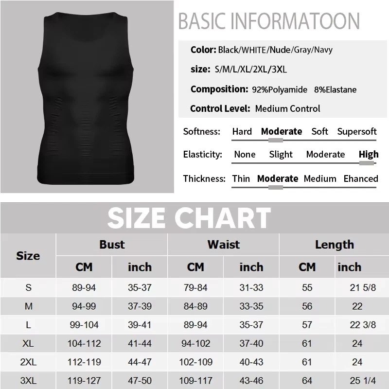 The Men Body Shaper Slimming Tummy Vest Thermal Compression Shirt Tank Top Shapewear by SKT is a comfortable and stylish shapewear piece designed for both men and women. Made from a blend of spandex and polyamide, this tank top provides moderate compression in the body area, offering a slimming and firm control effect. With a vintage design and adjustable features, this shapewear is perfect for fitness, outdoor activities, or everyday wear, providing a lightweight and stretchy fit for all-day comfort. Available in a range of sizes and colors, this shapewear is a versatile and practical addition to any wardrobe. Men Slimming Corset Vest(Build your good stature) T-shirts and Vest for Men Shaper( Invisible underwear) Waist Size Chart(Please Check Your Right Size, 1"inch-2.54cm) Size (S): 27"~30"(inch) / 66cm~76cm Size (M): 30"~32"(inch) / 76cm~86cm Size (L): 32"~35"(inch) / 86cm~96cm Size (XL): 35"~38"(inch) / 96cm~106cm Size (2XL): 38~41"(inch) / 106cm~116cm Size (3XL): 41~44"(inch) / 116cm~126cm Features & Specifications Basic Information: Material: Nylon80%+Polyester20% / Nylon80%+Spandex20% Color: Black,White Size: S,M,L,XL,2XL Occasions: Perfect for workout, daily wear, home, sports, running, Gym Features: - COMFORTABLE FABRIC: High quality fabric for improving blood circulation and fat burning, wide shoulder straps & low collar design make you more comfortable to wear and easy to exercise. - COMPRESSION SHAPING: Strongly chest shaping to say goodbye to flabby fat. Special weave design on tummy enhances higher abdominal compression on the belly and reducing your belly size. - LET'S RESHAPE YOUR FIGURE: Our tank top effectively helps to tighten your loose skin, flatten your chest and abdomen, reshape your curve of waist and tummy to get the perfect posture. LOOKS THINNER AND MUSCLED Once put on our body shaper, you can get instant slimming results. It is specifically designed to hide Gynecomastia or "man boobs", tighten "beer belly" , smooth out love handles and eliminate back fat. With this body shaper, you will have a slim figure and a smooth body silhouette. HIGH QUALITY NYLON TO STAY SHAPE This body shaper is constructed by high quality Nylon. Stretchy and lightweight fabric offers full range of movement. The seams are very sturdy, unbreakable even under strong pull and won't lose its elasticity after use, which make it great for body shaping. body shaper for men, made of extremely breathable and sweat absorbing material, gives you lasting elegant sense and excellent comfort. - BACK SUPPORT: “X shape” - BACK SUPPORT: “X shape” back design provides stronger lumbar support, making you stand taller, look more confident and correct posture. Showcase The Model and Product For Blue Showcase The Model and Product For Beige Showcase The Model and Product For Beige Showcase The Model and Product For Black Showcase The Model and Product For Black Showcase The Model and Product For White short-sleeve Showcase The Model and Product For Black short-sleeve High quality nylon and spandex Elastic band Made of high-end nylon and spandex, our seamless shirts for men is very sturdy, unbreakable even under strong pull Wide neckline Can help you not feel the feeling of neck being strangled after walking or exercising It is soft and breathable for skin, keeping moisture wicking all day ⚡️Light Weight Vest -- This athletic top is made of top grade Nylon/Spandex blend material. It is soft and breathable for skin, keeping moisture wicking all day. This top is super-strong elastic, can expedite blood circulation, absorb heat and release sweat while exercise, offering excellent comfort and full range of movement. It also keeps you warm in the cold winter and give you a slim look.