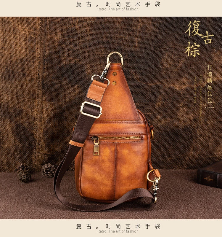Style:Sling Backpack,Chest bag,Crossbody Applicable scene: Hiking, Outdoor, leisure Material: cowhide leather Hardness: Soft Lining texture: polyester Opening method: zipper Internal structure: ID bag, mobile phone bag, laminated zipper bag, zipper pocket Function: wear resistant Color: Brown Show Color: Dark brown Size: 20cm*16cm*9.5cm/7.87 inch * 6.29 inch * 3.74 inch Weight: 0.78kg
