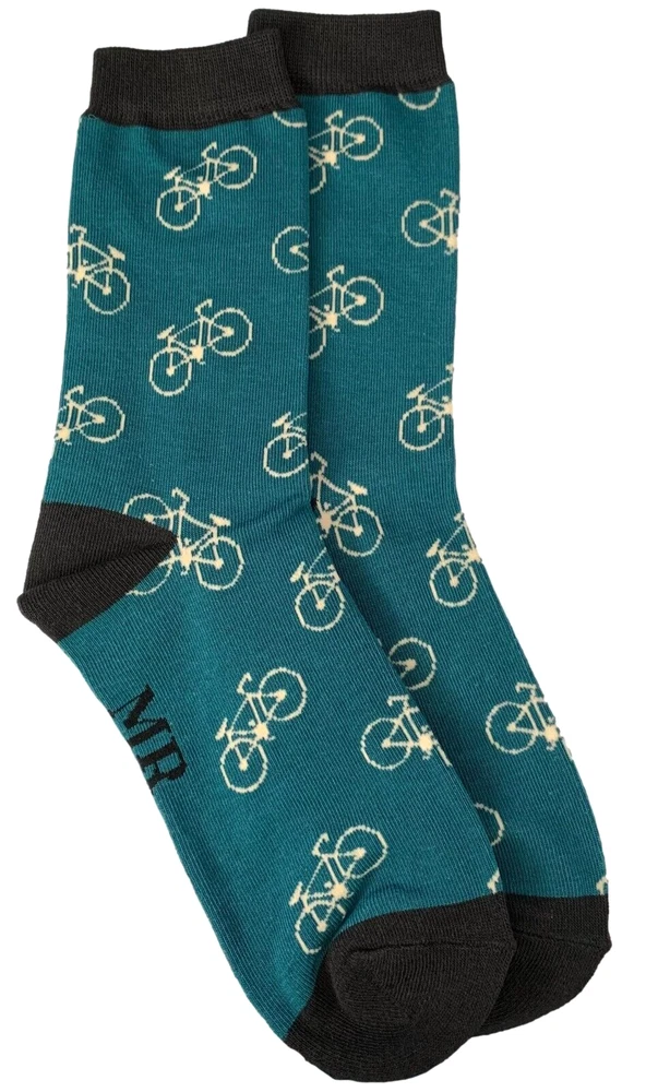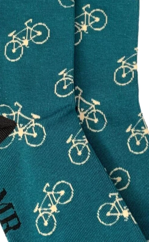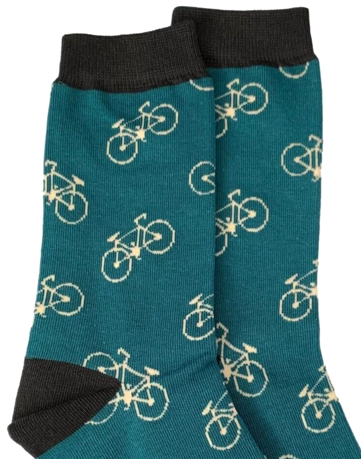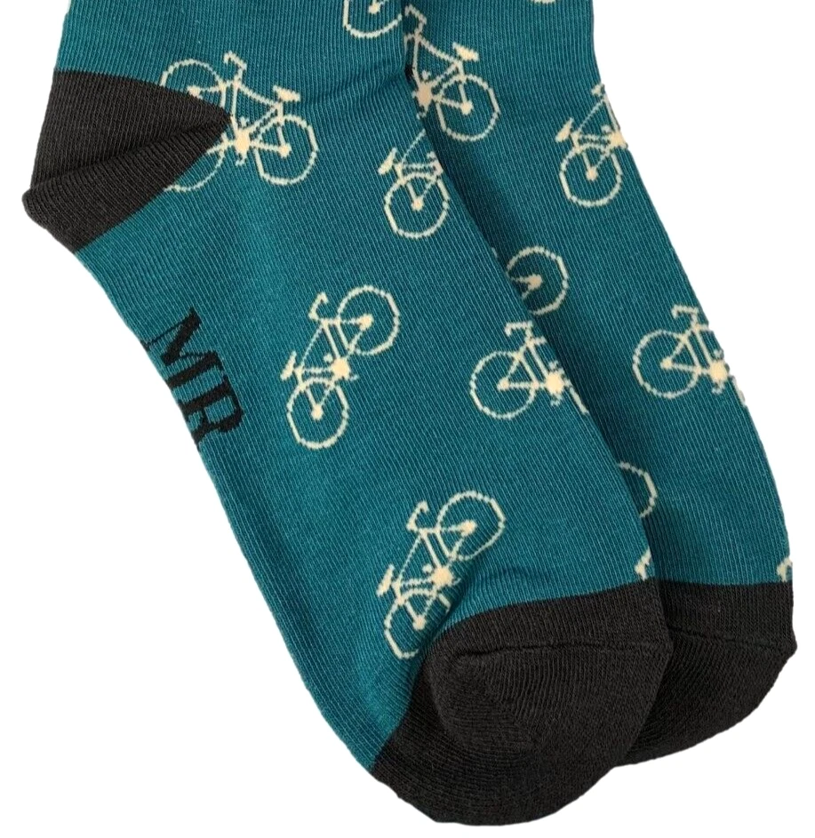 Men's teal coloured socks with contrasting black coloured trim and a bike pattern. Excellent quality, super soft and stretchy bamboo / cotton blend fabric ( 53% Bamboo, 19% Cotton, 19% Polyester, 7% Nylon, 2% Elastane ) The Benefits of Bamboo Material: Sustainable, Antibacterial, Hypoallergenic, Super Soft, Breathable. One size ( Mens UK Shoe size 7 - 11, EU 40 - 45 ) New with tags and FREE UK postage.