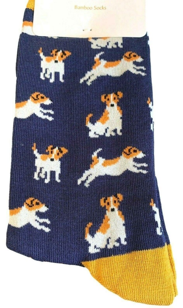 Men's navy blue and mustard yellow coloured socks with a Jack Russell dog pattern. Excellent quality, super soft and stretchy bamboo / cotton blend fabric ( 54% Bamboo, 22% Cotton, 16% Polyester, 6% Nylon, 2% Elastane ) One size ( Mens UK Shoe size 7 - 11) New with tags and FREE UK postage.