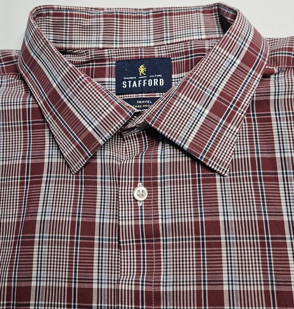Mens Stafford Travel Easy Care Broadcloth Long Sleeve Plaid Button Up Shirt 18 34-35 60-40 cotton/polyester blend Regular fit Great looking maroon multi plaid long sleeve button front shirt Easy care broadcloth Pocket Excellent used conditions VERY NICE PRE OWNED SHIRT FROM SMOKE FREE HOME. FAST SHIPPING WITH TRACKING INFORMATION PROVIDED.