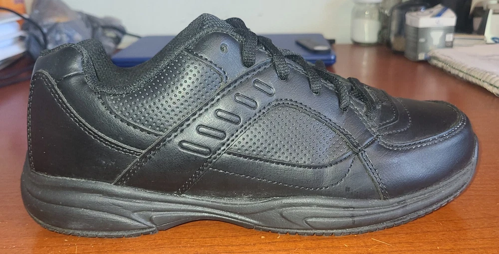 EU Shoe Size: 40 Brand: Safe T Step Type: Casual Lining Material: Fabric UK Shoe Size: 6.5 Toe Shape: Round Toe Department: Men US Shoe Size: 7.5 Style: Sneaker Outsole Material: Rubber Upper Material: Leather Color: Black Closure: Lace Up Shoe Width: W Features: Comfort Pattern: Solid Insole Material: Foam