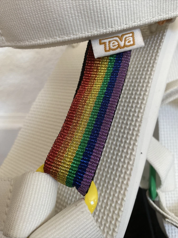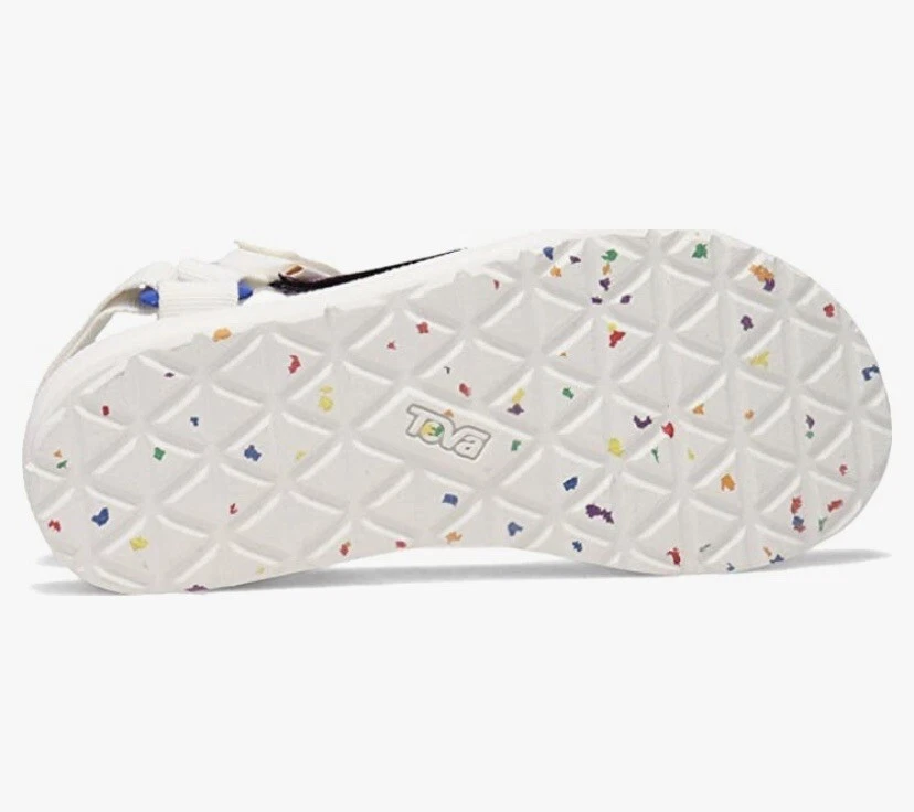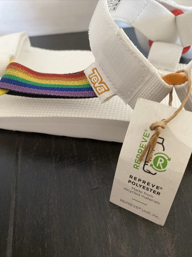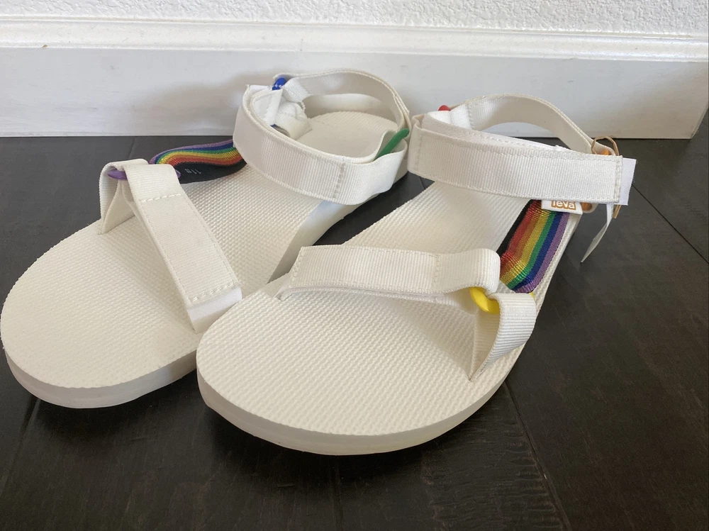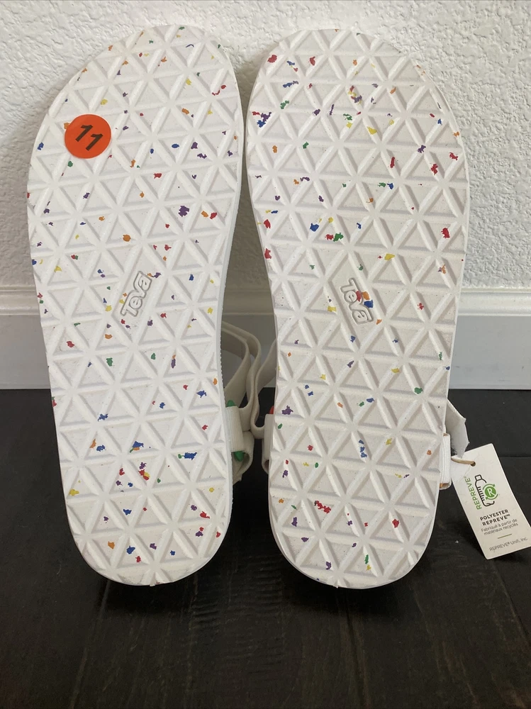 Teva Men’s Original Universal Pride Sandals White Rainbow Sz 11 NEW. Size: Men’s 11 Color: White Features: - Quick-dry webbing made from recycled plastic using traceable verifiable REPREVE polyester yarn by Unifi supports your foot and stands up to abuse; Universal Strapping Stytem Multiple points of adjustability let you dial in the absolute perfect fit. - Easy hook-and-loop closure comes on and off quickly and gets the fit just right. - Molded EVA midsole with heel cupping and arch cookie for added support; Rubber outsole for durability and traction. - Vegan footwear created using synthetic and plant-based materials. - Best for: Festival wear All-day wear. Condition - Brand new with tags! - No box From smoke and pet free environment Check out our store for more fantastic listings.