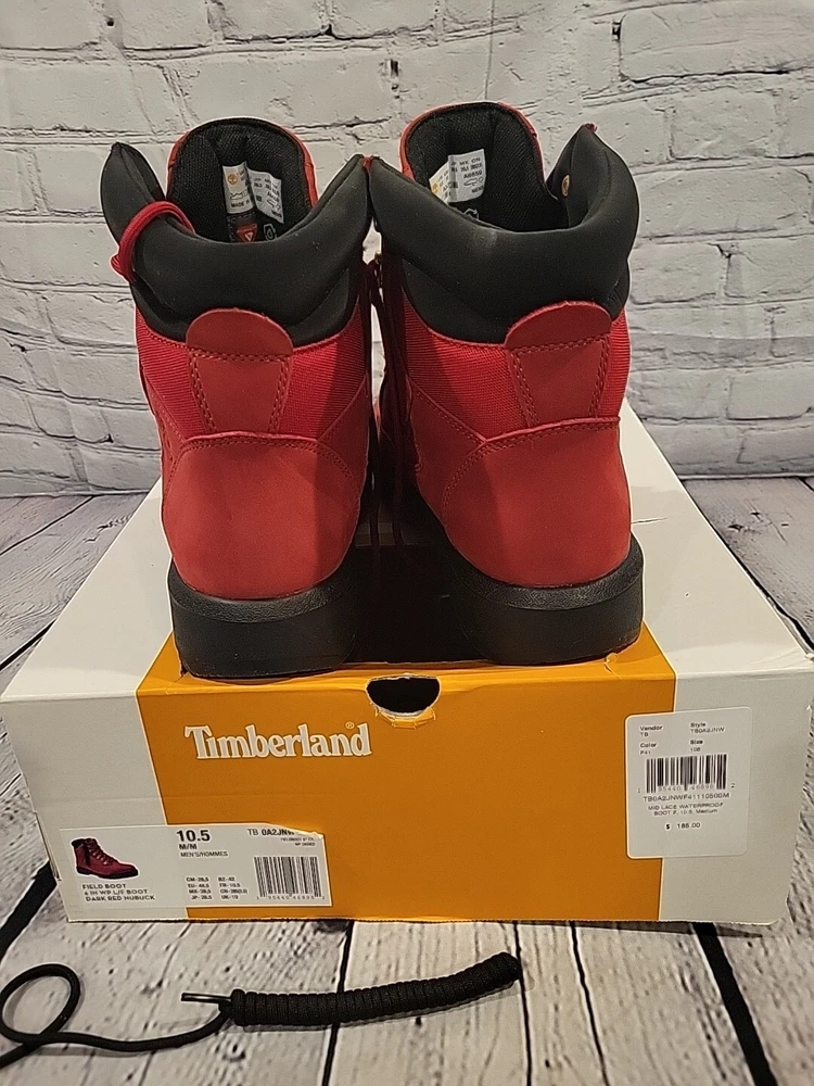 Step into the great outdoors or tackle urban jungles with the robust Timberland 6 In. Field Boot in a striking dark red hue. Crafted from premium nubuck leather, these boots offer durability and a comfortable fit that's ideal for an active lifestyle. The lace-up closure ensures a secure fit, making them perfect for both work and casual wear.The timeless solid pattern and medium-width build cater to a sleek yet versatile aesthetic, complemented by the practicality of a shoe designed for both male adventure-seekers and everyday commuters. The boots are a US size 10.5, and are not customized, ensuring you get the authentic Timberland quality and design intended. PLEASE NOTE: YOU WILL RECEIVE A SET OF BLACK LACES AS WELL TO SWITCH UP IF YOU DESIRE! IF YOU HAVE ANY QUESTIONS PLEASE ASK BEFORE PURCHASE AND I WILL BE HAPPY TO ANSWER. THANKS!