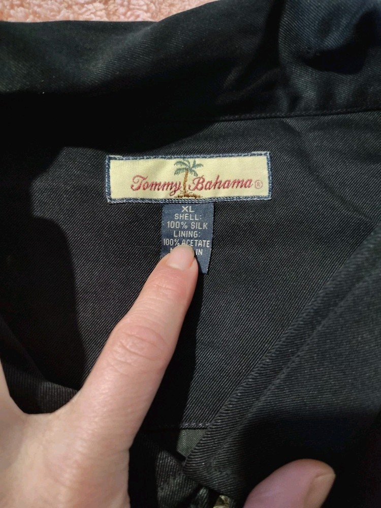 This men's Tommy Bahama black silk jacket in size XL features a full zip closure and a classic golf casual style. The softshell fabric, made of silk with an acetate lining, is perfect for the summer, fall, and spring seasons. This jacket is designed for casual occasions and is part of the Tommy Bahama product line. Made in China, this jacket is a stylish and high-quality addition to any man's wardrobe.