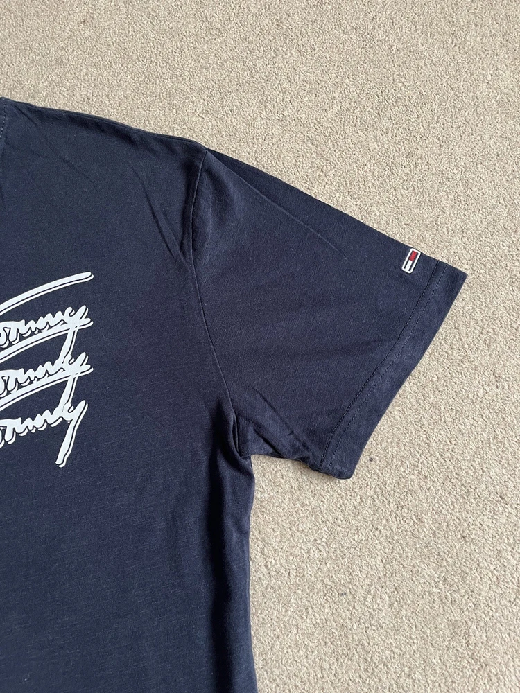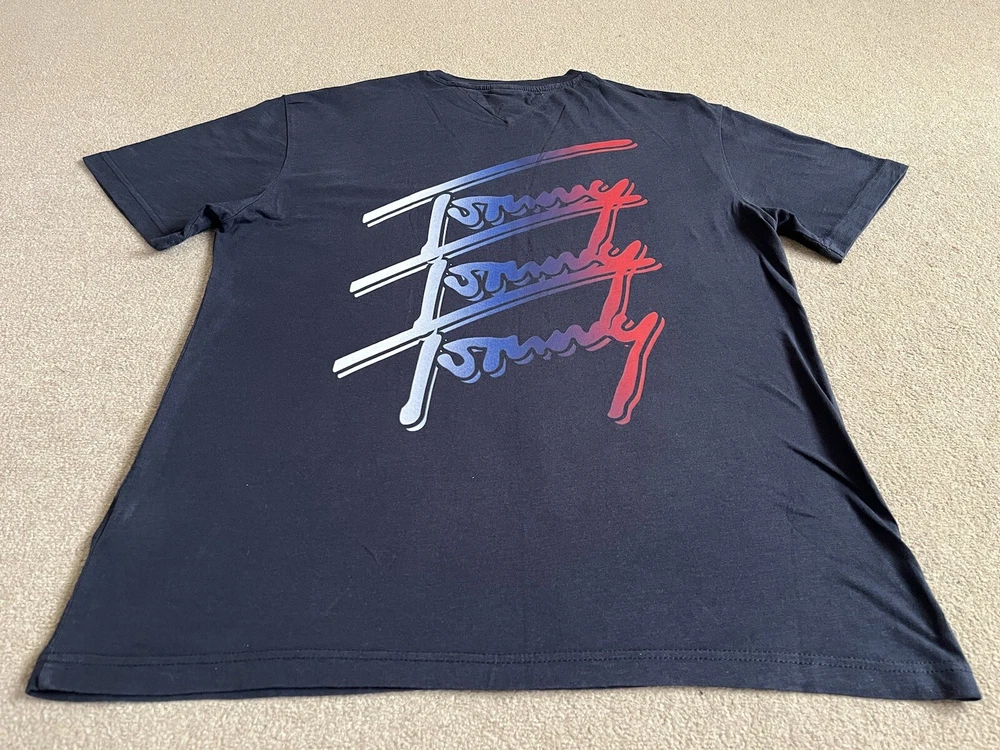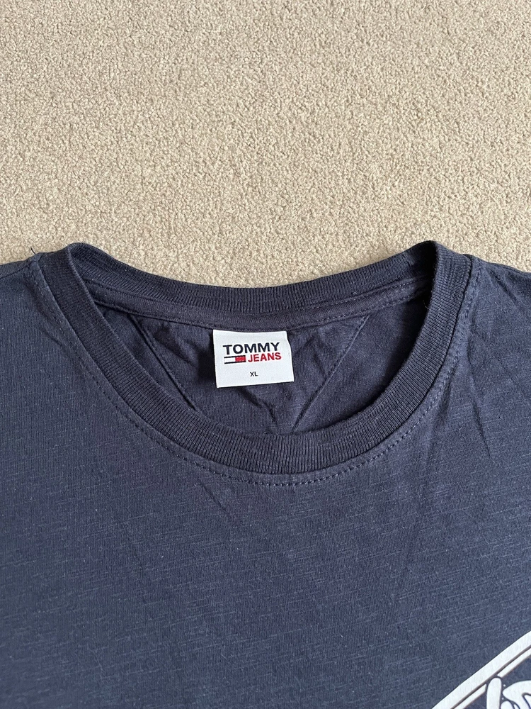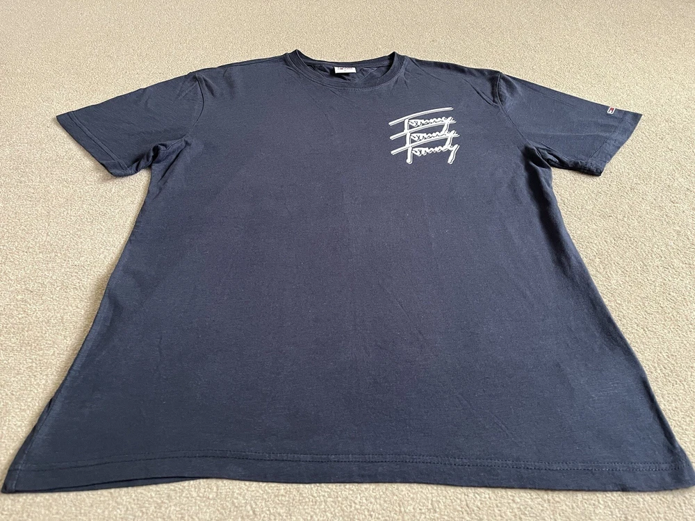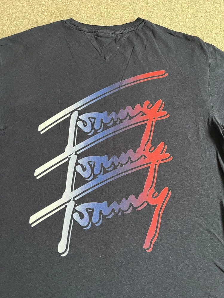 Men’s Tommy Hilfiger Navy Blue T-shirt With Back print - Size XL. Condition is Used. Dispatched with Royal Mail 2nd Class.