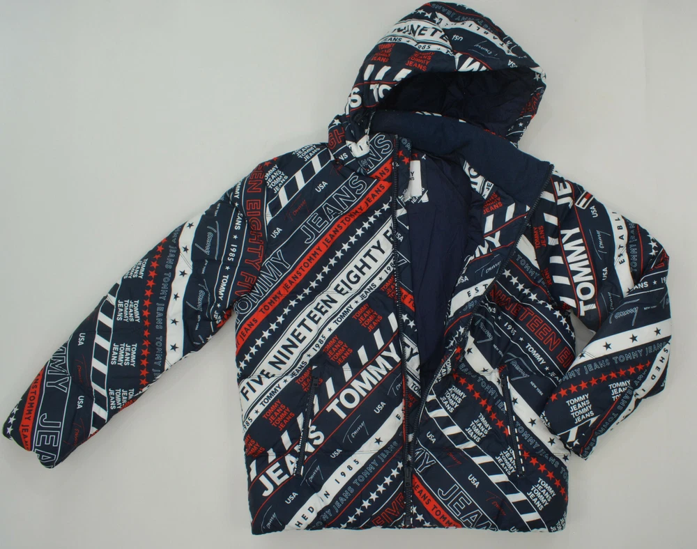 Genuine Tommy Hilfiger MEN'S LONG SLEEVE PUFFER JACKET Primaloft Collection Note: Hoodie/Hood can be removed as in the picture. Size: Select Color: Navy (See Picture) Material: 100% Polyester Jacket Fillings: 100% Polyester Style: Puffer Jacket