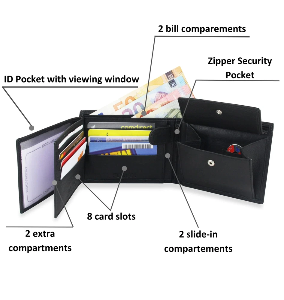 Description Discover the ultimate blend of style, functionality, and security with our Men's Trifold Genuine Leather Wallet in Black. Crafted from high-quality genuine leather and accented with sturdy double stitching, this wallet is built to last. Organization is effortless with its trifold design, featuring 9 card slots, 2 spacious bill compartments, 4 large sections for IDs and receipts, a convenient coin pocket, and a secure zipper pocket for added versatility. Whether you need quick access to your debit cards or a safe spot for your spare change, this wallet has you covered. For added peace of mind, our wallet comes equipped with RFID protection, safeguarding your personal information from unauthorized scanning. No need for additional protective sleeves or cards — your essentials are protected within its sleek design. Ideal for any occasion, it arrives beautifully packaged in an elegant gift box, making it a perfect choice for birthdays, anniversaries, or any special celebration. Elevate your everyday carry with the sophistication and practicality of our Men's Trifold Genuine Leather Wallet. PREMIUM QUALITY: Crafted from 100% genuine leather with durable double stitching, ensuring long-lasting use. AMPLE STORAGE: This trifold wallet features 9 card slots, 2 bill compartments, 4 large sections for IDs and receipts, plus a coin pocket and a secure zipper pocket. SMART DESIGN: Includes 3 clear ID windows, perfect for displaying photos, driver’s licenses, or other important IDs. RFID BLOCKING: Built-in RFID protection keeps your personal data safe from electronic theft, eliminating the need for extra sleeves or cards. PERFECT GIFT: Comes in an elegant gift box, making it an excellent choice for birthdays, anniversaries, or any special occasion.
