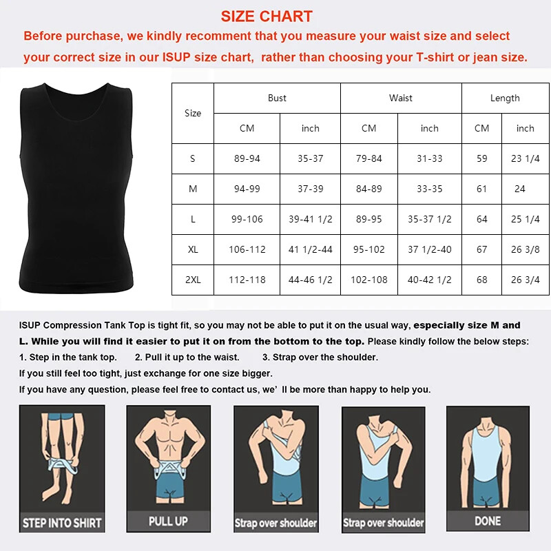 Description Color:Black/White Material:92%Polyamide,8%Elastane Asian Size:S/M/L/XL/2XL SHAPE YOUR BODY- This FAT BURNING ASSISTANT will hide "man boobs" very well, tighten "beer belly" in front, trim love-handles on sides, eliminate back fat, dramatically improve posture on the back with crisscrossing back panels. LIGHT WEIGHT UNDERSHIRT-Invisible under all your clothes, such as suits, formal dress shirts, workout shirts, t-shirts, polos and sweaters. Wear it anytime, anywhere, look inches smaller and pounds thinner. This Compression Vest is the best choice for body shaping, definitely a secret weapon that brings your self-esteem back. HIGH QUALITY NYLON AND SPANDEX TO STAY SHAPE- This body shaper is made of high-end Nylon and Spandex, there must not be even a single sloppy stitch, the seams are very sturdy, unbreakable even under strong pull and won't lose its elasticity after use. Wear this firming tee flattens your chest, stomach, back fat.This male Shapewear best for zumba, yoga, gym, fitness, running, jogging, hiking, cycling and much more sports. EXCELLENT COMFORT- The light, highly-elastic fibre offers full range of movement, extremely breathable, sweat absorbing and heat releasing, accelerate Weight Loss by speeding up metabolism . Not only maintain the natural texture, also keep the lasting elegant sense and excellent comfort. This Slimming vest give you 360 degree superior support and stay comfortable all day long. 【HOW TO WEAR】- You may not be comfortable when you wear this compression shirt for the first time, it will be a tight fit. But you'll get used to it after a week. We strongly suggest you to gradually prolong the time of wearing until you get used to it. Wearing our slimming body shaper, with healthy eating and scientific exercise, you'll be successful in weight loss. Size Chart Attention: sleeveless style please wear from below Model Show