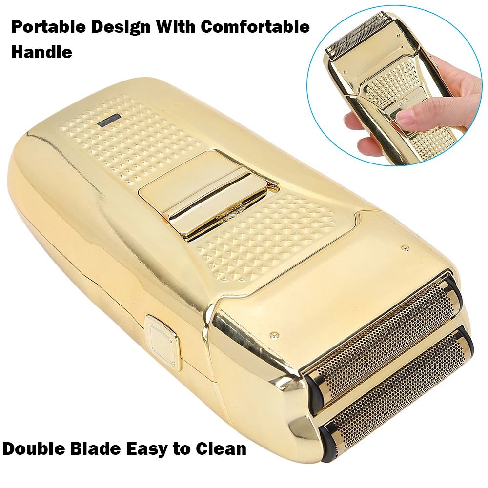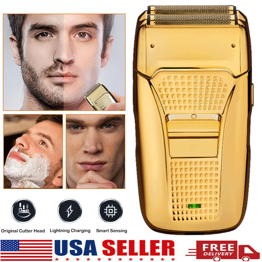 Des c ri p tion: Comfortably Fits Facial Contours: Alternate shaving design, elastic facial adjustment system, conforms comfortably to facial contours, no residue after shaving. Double Blade Design: Slim Screen Knife Net, Floating Face Adjustment to Quickly Capture Beard. Double blade design, fast cutting beards, incisive and not glued. Dual-purpose charging plug: Dual-use charging and plug, USB charging design, equipped with USB charging cable, can be connected to a variety of USB power ports, convenient charging. Multifunctional: Multifunctional, can be used to shave the bald head and shave the beard. Conforms to the ergonomic design, easy to grip and use. Easy to carry: Light and small in size, equipped with a storage bag, easy to carry when going out. Condition: 100% Brand New Item Type: Razor Material: ABS Color: Gold/Gray Power: 3w Charging Time: 5 Hours Use Time: 50 Minutes Battery: Lithium Battery 600mAh Battery Model: 14500 Razor Size: Approx. 12.5 x 6.5 x 3cm / 4.9 x 2.6 x 1.2in Weight : 270g(with box) Package List: 1 x Razor 1 x Storage Bag 1 x Transparent Cover 1 x Head Cover 2 x Half-Round Knife 1 x Cleaning Brush 1 x Manual 1 x USB Charging Cable