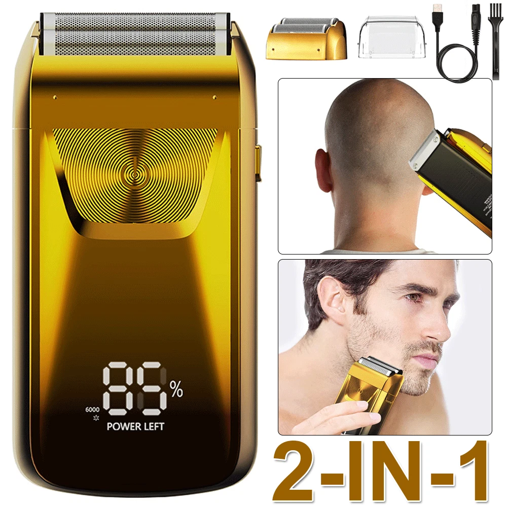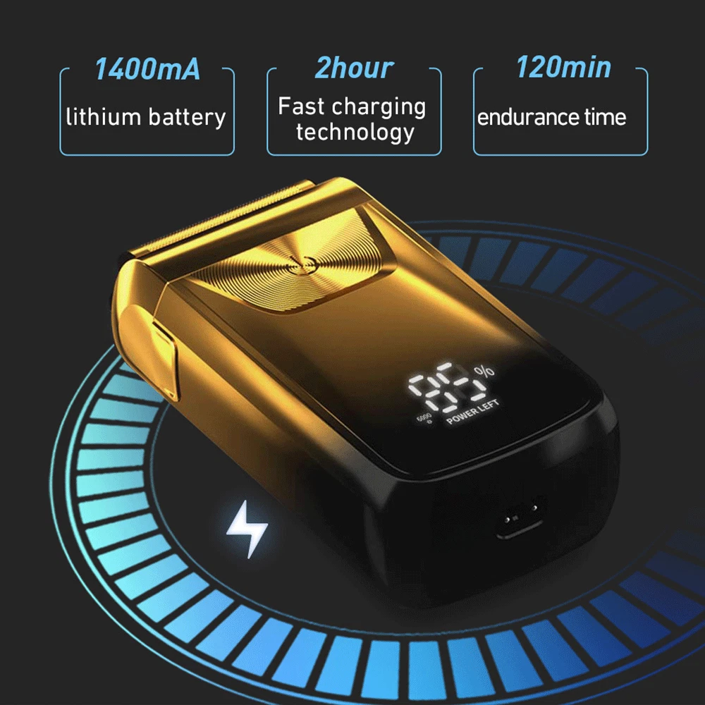 Description ★ Foil shaver: Easily and comfortably trims face, neck and chin. Safe and clean without hurting the skin. ★ Speed: The shaver has 3 speed adjustments. 6 500RPM at most. Give you a quick shave. ★ Pop-up trimmer: Easily and quickly trim longer beards and sideburns for you. Leaves your face refreshed and cleansed. ★ LED: The LED display clearly shows the remaining percentage of the battery. Reminds you to recharge your hair shaver. ★ Battery power: The shaver has a built-in 1 4 00mAh battery, which can be used for up to 1 2 0 minutes after charging for 2 hours. Product Details : Material: ABS Color: Gold /Sliver Power: 5 w Charging Time: 2 Hours Use Time: 120 Minutes Battery: Lithium Battery 14 00mAh Size: Approx. 12x6x3.8cm / 4.7*2.3*1.5inch What You Get : 1 * Men's Shaver 1 * Spare Shaving Head 1 * USB Charging Cable 1 * Clean Brush 1 * Protective C over 1 * Instruction manual