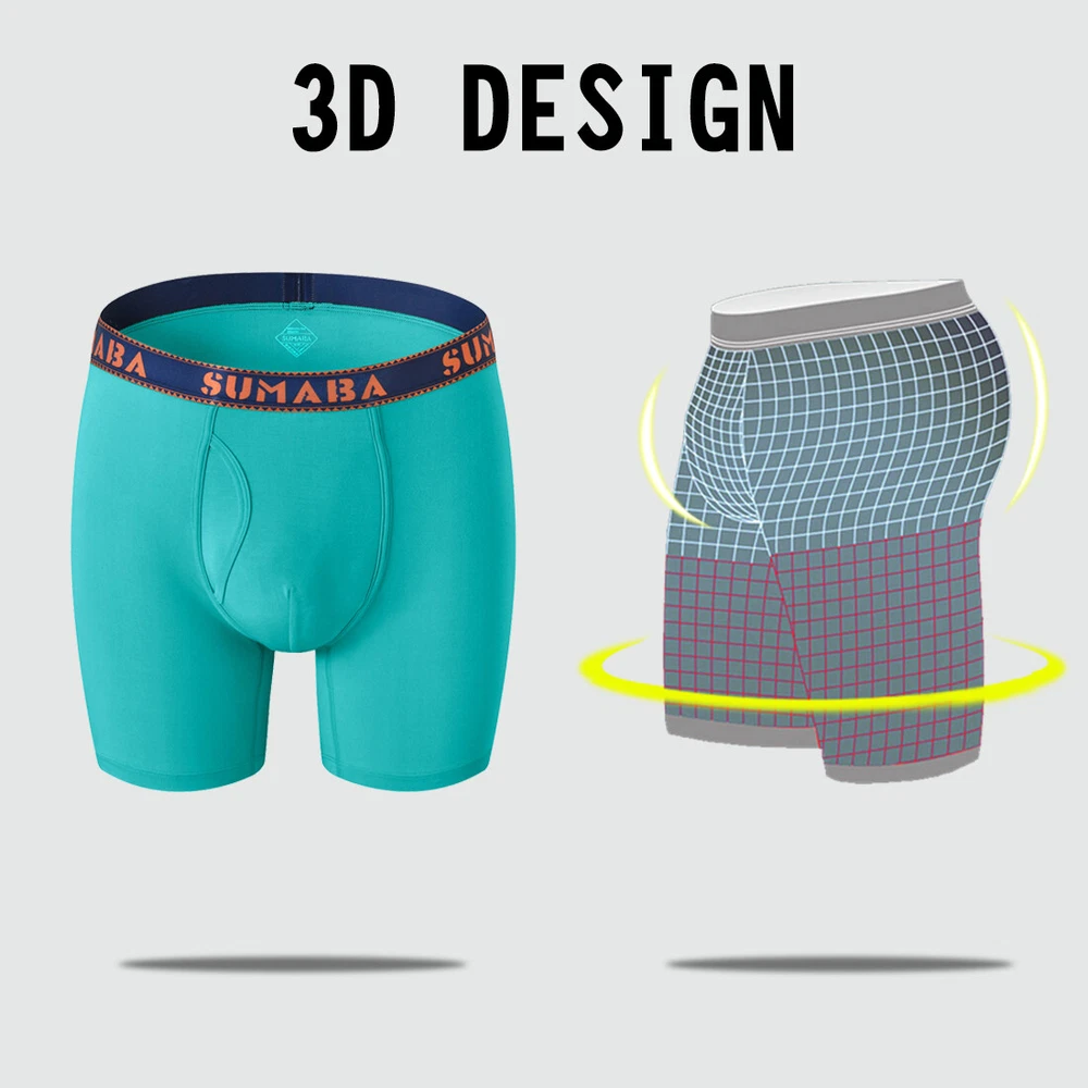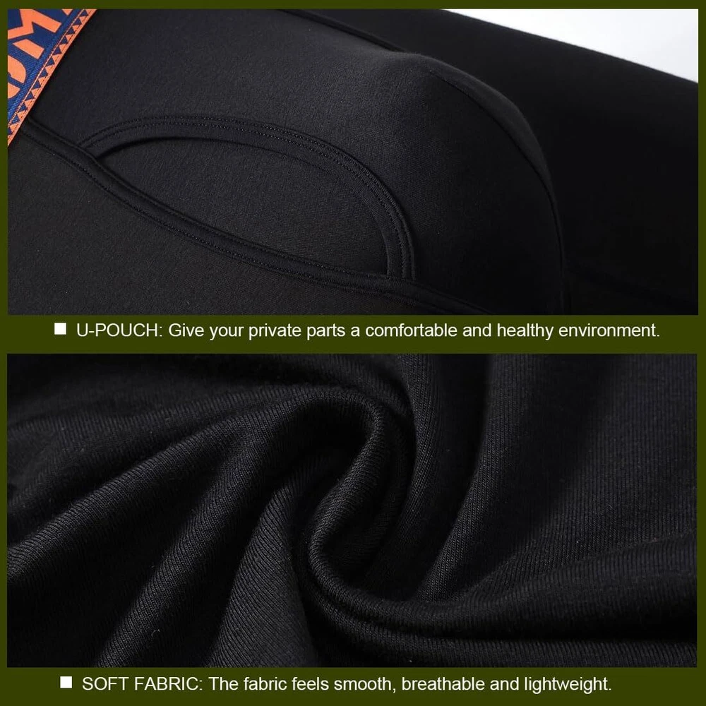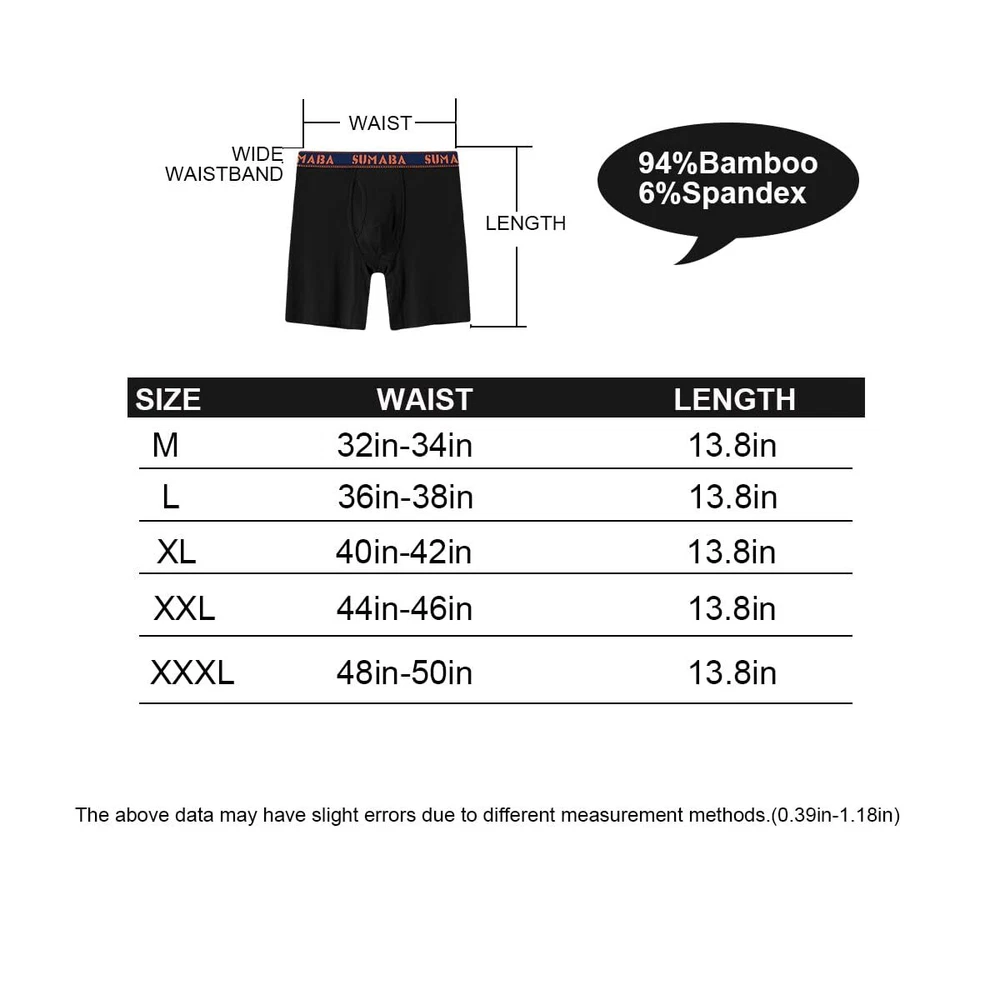 About this item 【SUPERIOR FABRIC】This classic bamboo underwear for men is made of Bamboo Viscose with 6% spandex, soft and elastic, which make it a comfort flex fit boxer briefs for men, men's breathable underwear boxer briefs moisture-wicking. This lightweight men‘s briefs underwear is soft, functional and hard-wearin 【UNIQUE DESIGN】This long boxer briefs underwear for men features 3D U pouch with fly front opening covered, enough space for bulge and has funtional enhancing effect. Elastic waistband in contrast color with letter print make it fashion and special. 6 inches inseam men boxer briefs increase comfort and keep warm 【INTIMATE DETAILS】Tagless boxer shorts for men and big boys won't pinch or bind, make sure comfort. Elastic Mid-rise waist design of this anti chafing boxer briefs for man is for easy pull on and take off. Long leg trunks for men with our good struction design would cover your thigh well to prevent cuffs ride-up and hike up in the base of thigh, make sure comfortable and functional 【WASH CARE】Machine or Hand Wash Cold, Do Not Bleach 【WAIST SIZE】5 Sizes of this men shorts available. M=32-34'', L=36-38'', XL=40-42'', XXL=44-46'', 3XL=48-50''