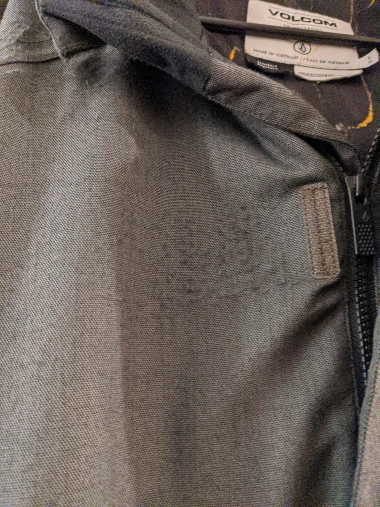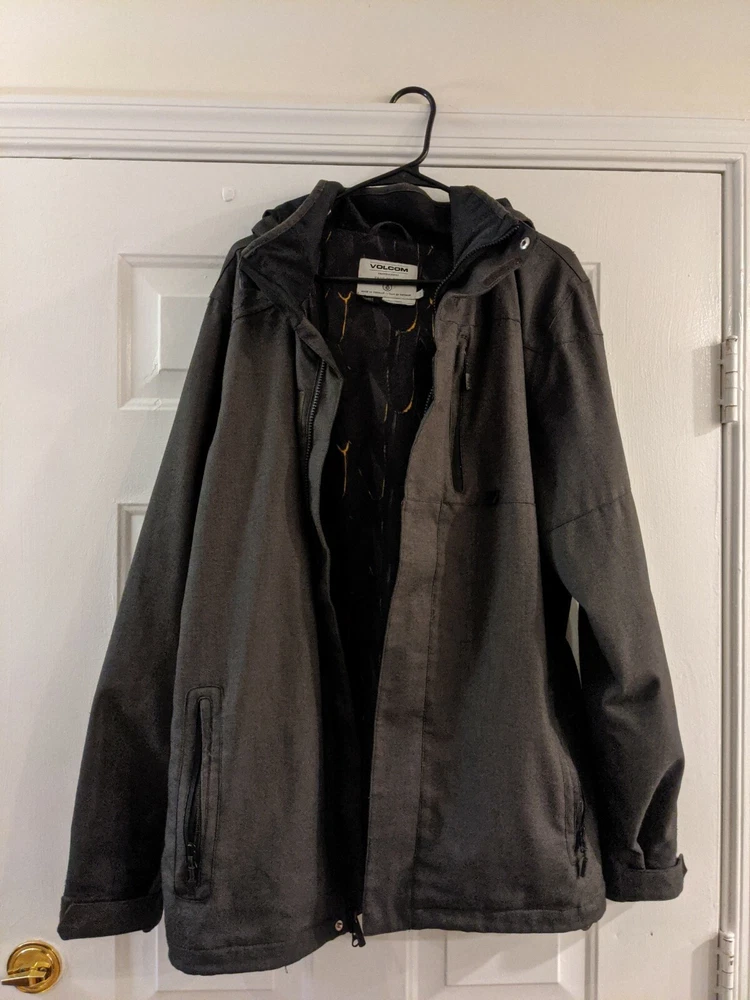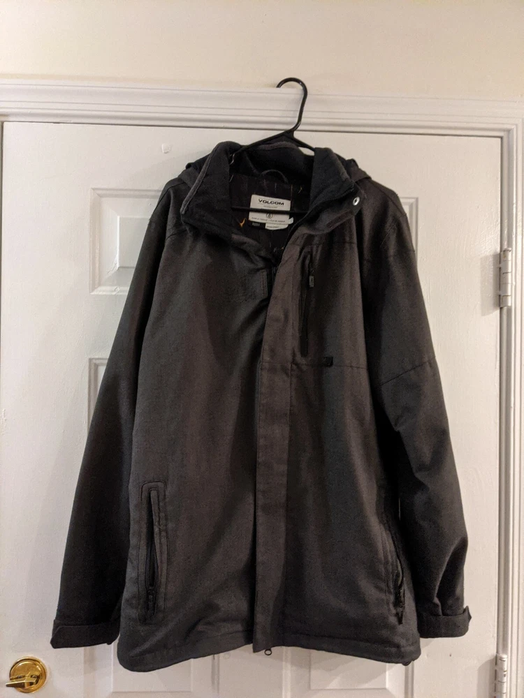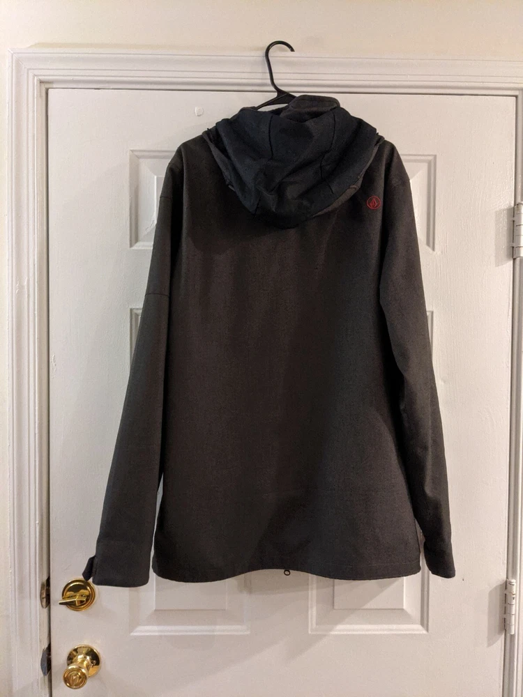 Men's VOLCOM Snowboarding Jacket NEW Ski Gray Polyester Hood Size L. Stipulations- I do not accept returns of my items. They will be described in detail and photos are listed. Clothing may be gently used. Any imperfections will pointed out. Most are hard to find items. I wrap and ship with great care and photograph items in this state. Please look at the item photo carefully before buying. Thank you. -Some flaws around sleeve area and where the velcro is on the coat. -Otherwise in good shape!