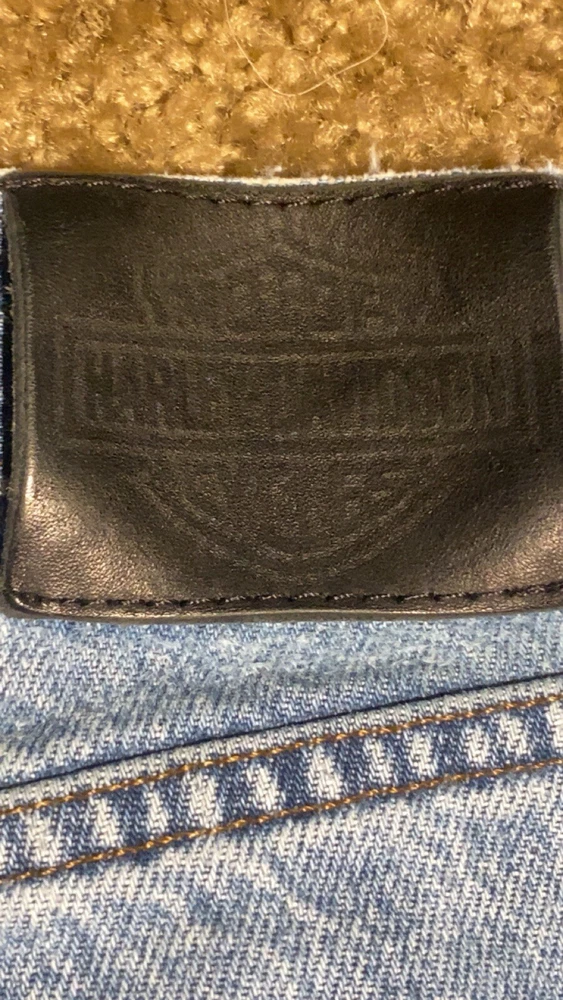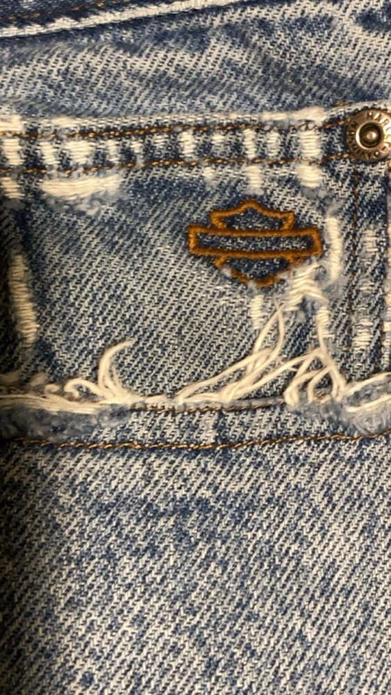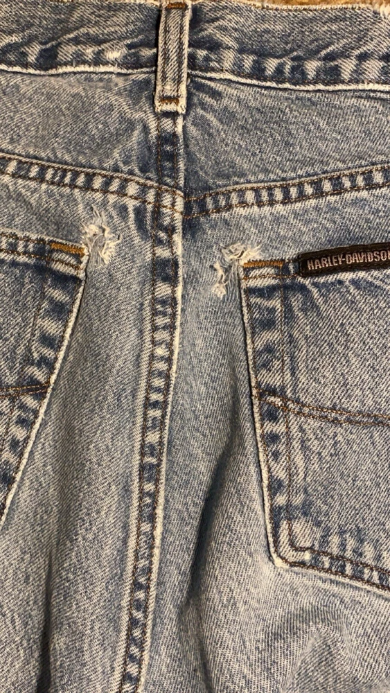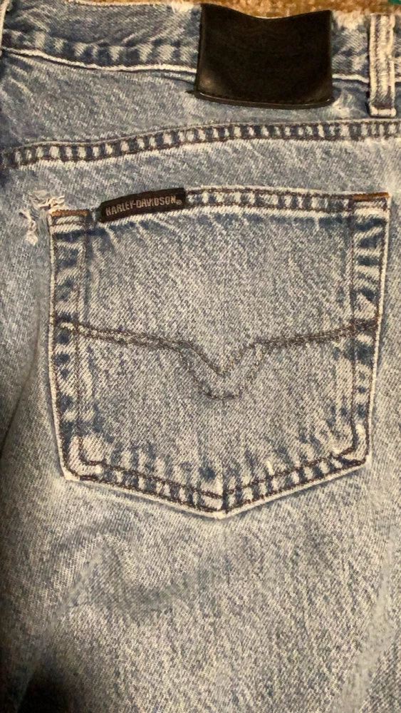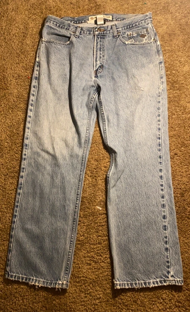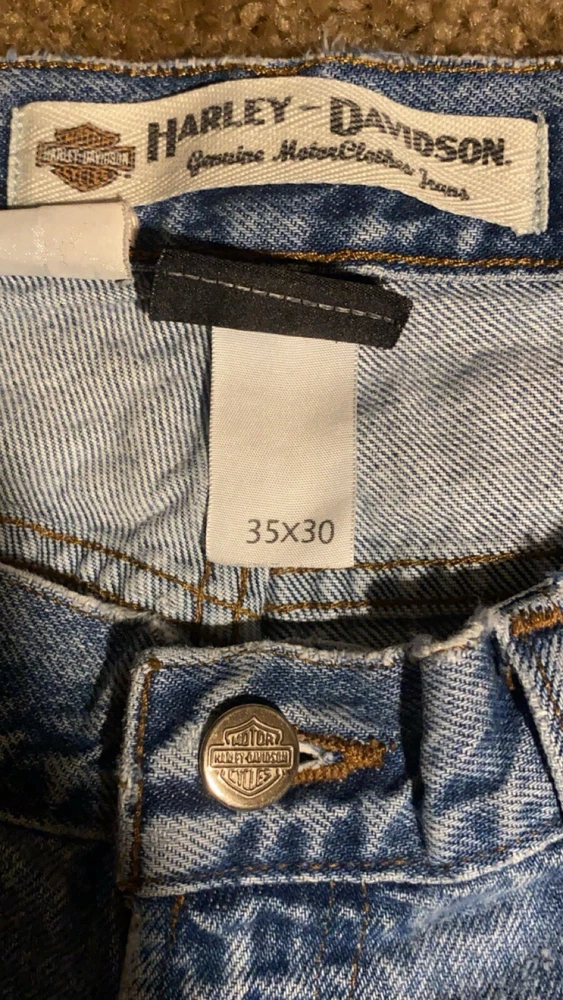 These jeans are very cool they do however have a few small holes as they are vintage and comes with it!! I have tried to photograph them the best I could, however the jeans are still structurally sound and have plenty of life in them! Step up your denim game with these vintage Y2K Harley-Davidson straight leg jeans. Made with high-quality cotton material, these blue jeans are perfect for any casual occasion. Featuring a zip closure and a 30-inch inseam, these jeans are a must-have for any Harley-Davidson fan. Not only are these jeans stylish, but they also come in a size 35x30, making them perfect for regular-sized men. The distressed detail adds a touch of edge to these classic jeans, making them a great addition to any wardrobe. Don't miss out on the opportunity to own a piece of Harley-Davidson history.