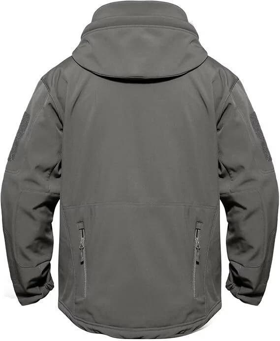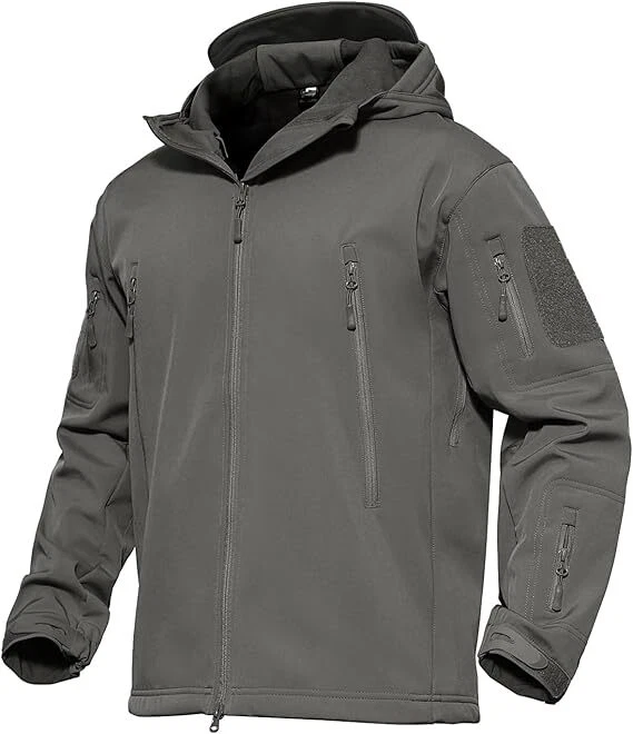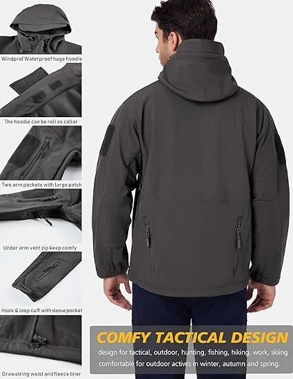 Product Description Classic tactical jacket, comfortable for all outdoor activities. it can keep you dry in the small rain and snow, also block all wind and keep the cold air out. Flexible & Multi-function. 100% polyester soft shell fabric, with thermal fleece liner, keep you pretty warm in winter. Waterproof & Windproof; Men's Clothes Zipper; Huge hood can be roll up; Two way zip up to open or close; Under arm vent zippers; Hook & loop adjustable wrist cuff; Drawstring waist and hood; Large loop on both arm for individuality patches. Tactical multi-Pockets design: 2 large zippered chest pockets; 2 back pockets; 2 small pockets on left arm and 1 small pockets on left sleeve. Good for winter, autumn and spring. Great for outdoor sport, hunting, fishing, hiking, climbing, camping, travelling, motorcycle, cycling, work and casual wear. Model Show Applicable scene