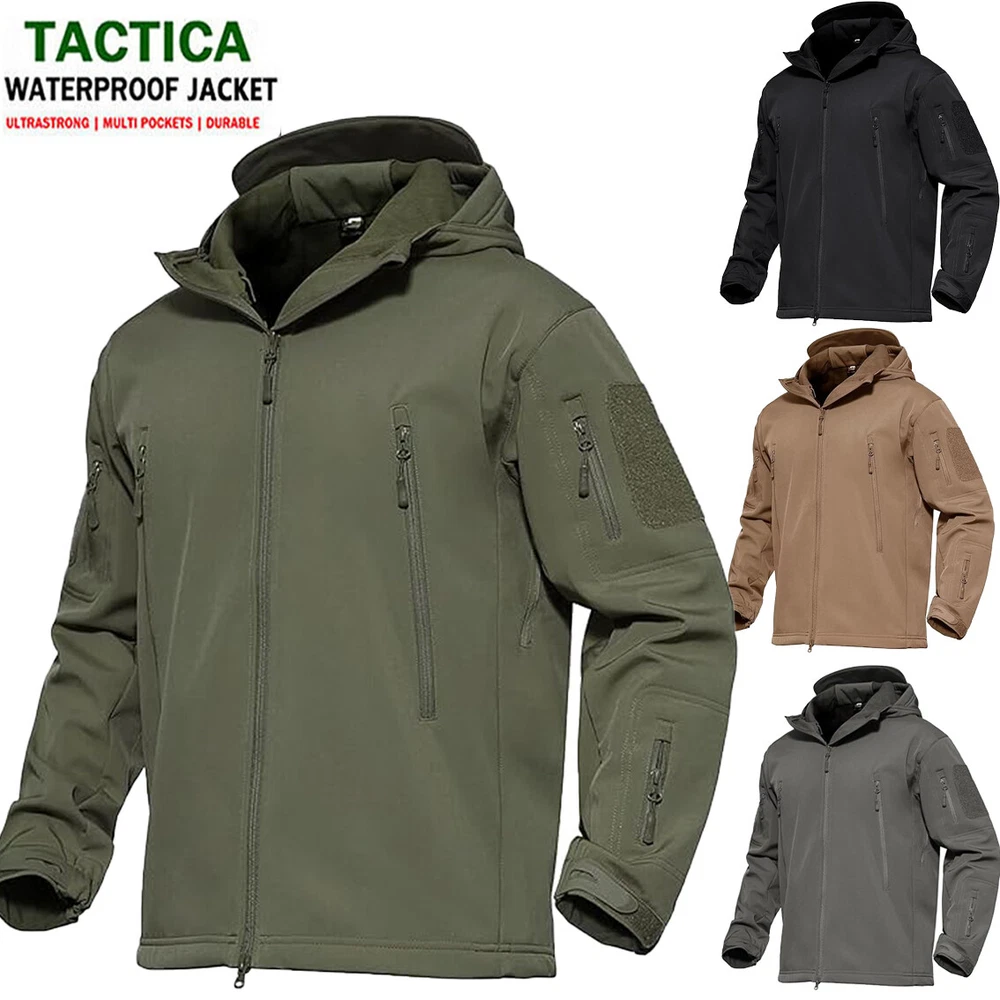 Product Description Classic tactical jacket, comfortable for all outdoor activities. it can keep you dry in the small rain and snow, also block all wind and keep the cold air out. Flexible & Multi-function. 100% polyester soft shell fabric, with thermal fleece liner, keep you pretty warm in winter. Waterproof & Windproof; Men's Clothes Zipper; Huge hood can be roll up; Two way zip up to open or close; Under arm vent zippers; Hook & loop adjustable wrist cuff; Drawstring waist and hood; Large loop on both arm for individuality patches. Tactical multi-Pockets design: 2 large zippered chest pockets; 2 back pockets; 2 small pockets on left arm and 1 small pockets on left sleeve. Good for winter, autumn and spring. Great for outdoor sport, hunting, fishing, hiking, climbing, camping, travelling, motorcycle, cycling, work and casual wear. Model Show Applicable scene