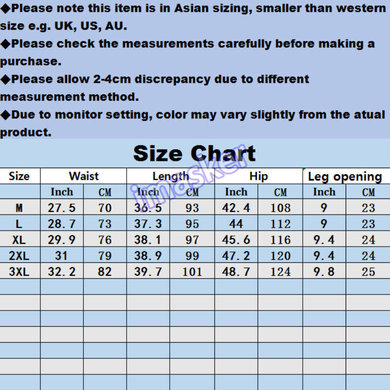 Store category Sign Up Now ! You may also like Product Description Please note this is in Asian sizing, smaller than western size e.g. UK, US, AU. Please check the measurements carefully before making a purchase. Please allow 2-3cm discrepancy due to different measurement method. Photos may slightly different from actual item\'s color due to the lighting during photo shooting or the monitor\'s display. If you are not sure which size to buy, please provide height and weight, we will recommend a suitable size. Real Size Infomation Unit:cm/inch 1Inch=2.54cm Size: M-3XL M: waist: 27.5in/70cm, length: 36.5in/93cm, hip: 42.4in/108cm, leg opening: 9.0in/23cm L: waist: 28.7in/73cm, length: 37.3in/95cm, hip: 44.0in/112cm, leg opening: 9.0in/23cm XL: waist: 29.9in/76cm, length: 38.1in/97cm, hip: 45.6in/116cm, leg opening: 9.4in/24cm 2XL: waist: 31.0in/79cm, length: 38.9in/99cm, hip: 47.2in/120cm, leg opening: 9.4in/24cm 3XL: waist: 32.3in/82cm, length: 39.7in/101cm, hip: 48.7in/124cm, leg opening: 9.8in/25cm Material: polyester Color: black, beige, khaki Payment Delivery details Terms of sales About us Contact us Payment 1. We accept PAYPAL only. 2. Payment must be made within 7 days of auction closing (Unpaid dispute will automatically open when item is not paid in 7 days). 3. PLEASE NOTE: SHIPPING&HANDING DOES NOT INCLUDE DUTIES, LOCATL TAXES OR ANY OTHER IMPORTATION FEES. 4. Please list your special requests (color, packages, value of declaration, etc.) in the EBAY NOTES SECTION when you make payment Shipping 1. We Ship to Worldwide 2. We ship your orders within 1-2 business days after the payment cleared. 3. Item shipped from China via china Post Airmail, reach most of the countries within 2 to 4 weeks. 4. Delivery time depends on destination and other factors, it may takes up to 20 days. If you don't receive the item after 25 days,please contact us, we'll investigate and solve the delivery problem. 5. Import duties, taxes, and charges are not included in the item price or shipping cost. These charges are the buyer's responsibility. Please check with your country's customs office to determine what these additional costs will be prior to bidding or buying. Warranty Return 1. Customer satisfaction is our top goal. All products are quality checked. They are new and in good condition when shipped to our customers. If product is defective or damage upon arrival, or wrong product shipped, please contact us immediately. Returns accepted within 14 days of delivery date and item must be in original new condition, not worn or altered in any way with attached tags & wrap. Otherwise deal is final. Return shipping must be paid by buyer. 2. Please contact us first if you have anyproblems/questions/concerns. We will be happy to resolve any issues you may have in a cordial and friendly manner. 3. We appreciate your Positive Feedback, and will do the same in return. PLEASE DO NOT leave negative feedback without first communication with us. Please allow max 24 HOURS for us to respond About Feedback We maintain high standards of excellence and strive for 100% customer satisfaction! Feedback is very important to us. We request that you contact us immediately BEFORE you give us neutral or negative feedback, so that we can satisfactorily address your concerns.It is impossible to address issues if we do not know about them! Contact Us We care about our valued customers, if you have any questions, please feel free to contact us in EBAY MESSAGE, our Customer Service staffs will be very pleasure to reply you in 24 Hours.