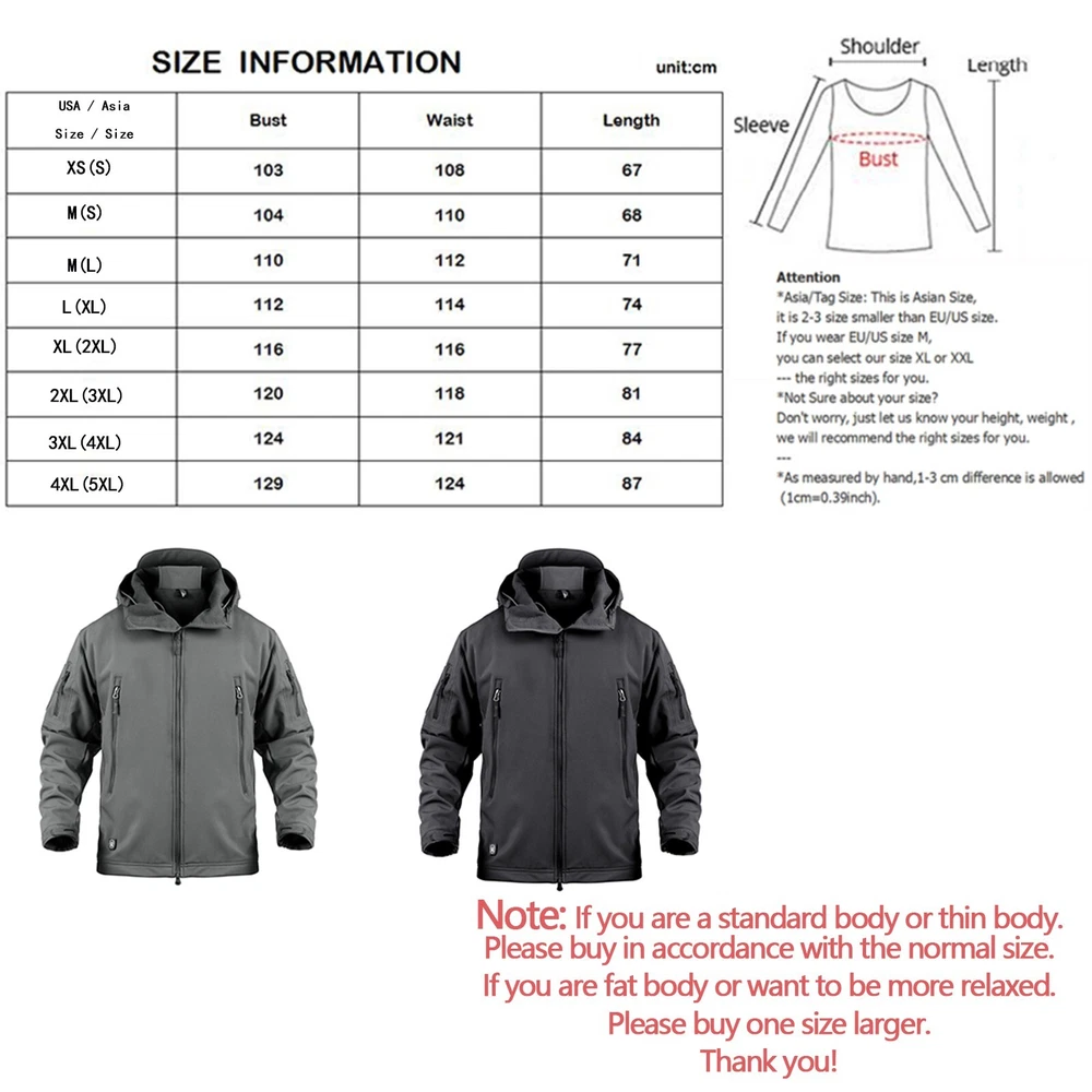 Pattern: Solid / Camouflage Lining Material: Polyester Accents: None, Button, Zipper Personalize: No Closure: Drawstring, Zip Collar Style: Hooded Windproof Security jacket: Tactical Fleece Lined Military Jacket/Windbreaker Type: Jacket Buyer Notice !: This Jacket can not be used as Raincoat. Warmth Weight: 800 Vintage: No Department: Men Garment Care: Hand Wash Only MPN: Does Not Apply Model: Jacket Performance/Activity: Skiing Size: L,XL,2XL,3XL,4XL Handmade: No Character Family: None Season: Fall, Spring, Winter Color: Black,Gray,Khaki,Green Occasion: Business, Casual, Travel, Workwear Country/Region of Manufacture: China Jacket/Coat Length: Mid-Length Attention !: Tag size was CN Size (different from your local) Lining: Fleece Lined Size Type: Regular Fit: Regular Brand: Unbranded Material: Acetate,Spandex Character: None AirSoft SoftShell: Military Army Lined Jacket Theme: 3D, 80s, 90s, American, Anime, Army, Outdoor, Shell Jacket Main Closure Zipper Side: On the Left Hand (Different from US Local Men's) Chest Size: Follow Size Chart Water Resistance Level: Water-Resistant Features: Waterproof Product Line: China Outer Shell Material: Soft Shell Style: Windbreaker Insulation Material: Polyester Fabric Type: Softshell