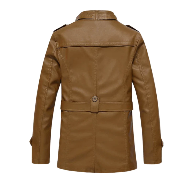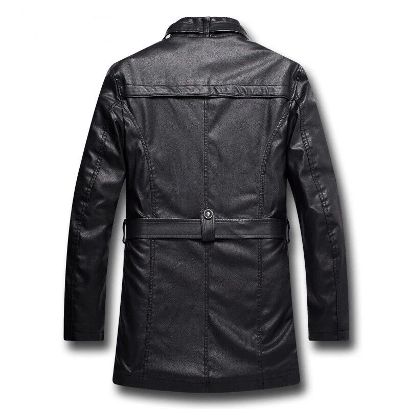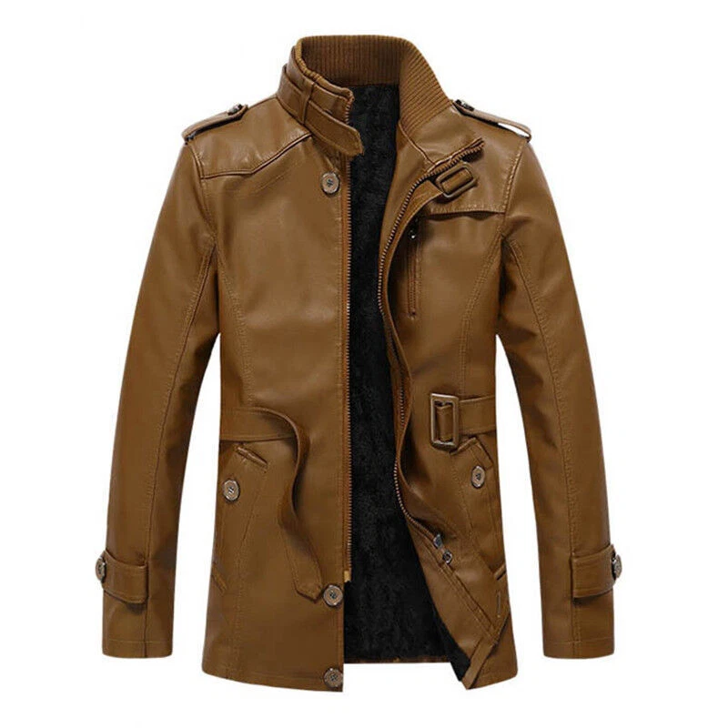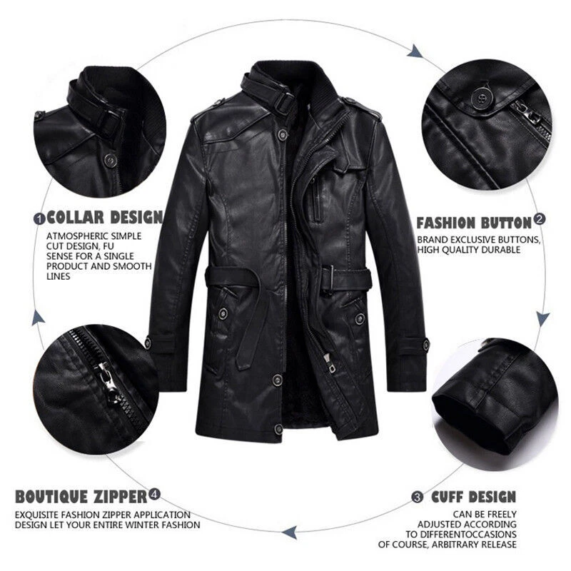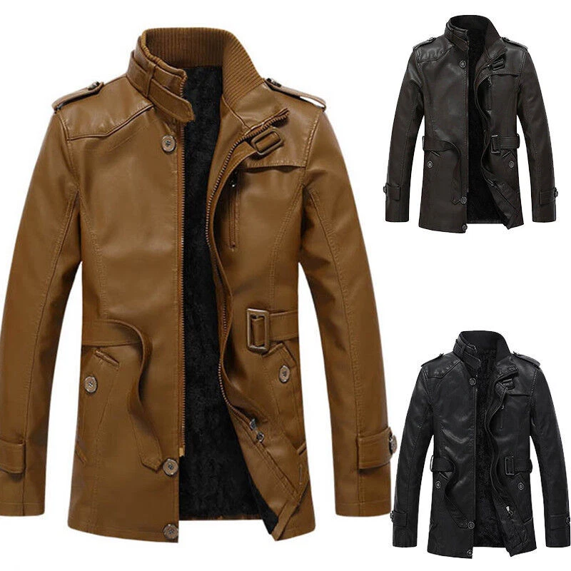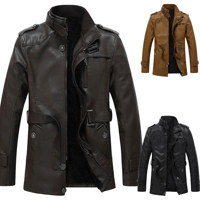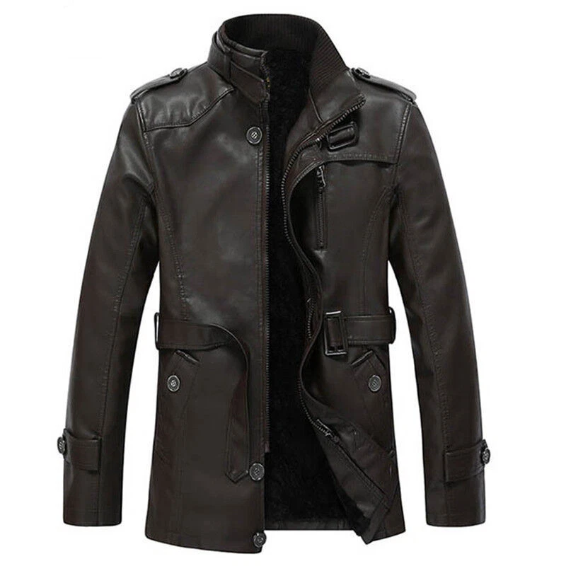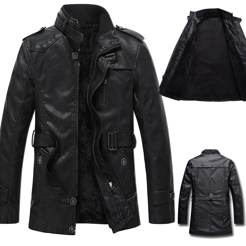 Mens Winter Warm Fur Fleece PU Leather Jacket Trench Coat Parka Outwear Overcoat