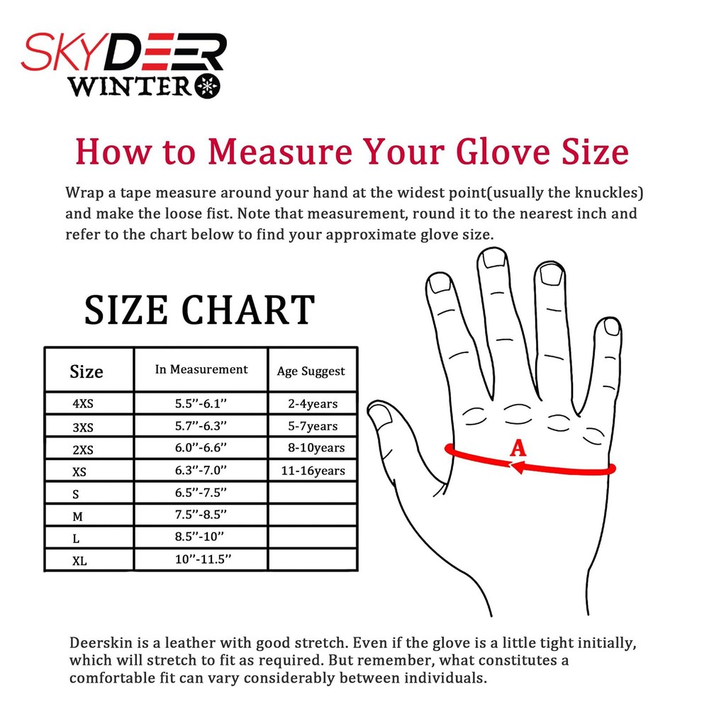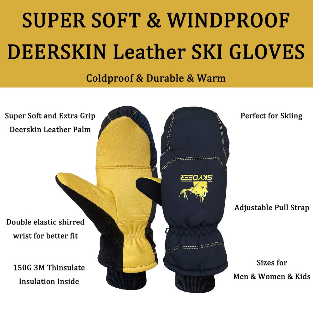[ Genuine Deerskin Leather Palm ] - Super softs, safe and protected! It absorbs impact and vibration. Premium Genuine Deerskin Leather is naturally soft and flexible, with good abrasion resistance. Compared to other similar items in the market, this ski glove is more wearable, more comfortable, warmer and more reliable [ Warm Insulation and Thermal Jersey Socked Lining ] - 150g 3M Thinsulate Insulation is warm yet lightweight, powerful yet thin. It helps trap hands heat while allowing moisture to escape. Protect your hands while you're out Skiing in cold temperatures [ Multiple Thermal Materials ] - From the back of the gloves to the inside of the gloves, there are multiple layers for thermal preservation: Deerskin Leather → Thermal Bladders → 3M Thinsulate Insulation → Breathable Windproof Layer → Skin-friendly Thermal Jersey Socked Lining [ Super Warm Design Function ] - Thermal and Windproof Bladder Inside Design is perfect for the winter snow sport and cold weather work. Suitable for snowboarding, Cross-Country skiing, snowmobile, ice fishing, shoveling snow, hiking, and other winter outdoor activities [ Size and Fitting ] - Double shirred elastic wrist designed to fit most of the hands, and the Deerskin is also had a good stretch [The Best Flexibility in Winter] - This gloves adopt human palm engineering technology provide Superior fitting, stretchy and not bulky
