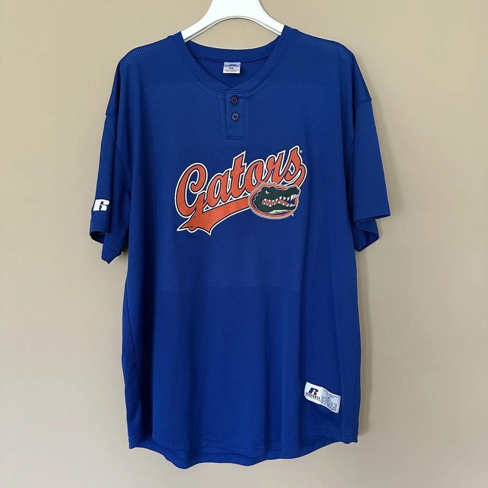 Men's XL Florida Gators Jersey Mesh Shirt Russell Athletic Henley Blue Orange approximate measurements lying flat length: 30" sleeve: 9" armpit to armpit: 25" 📦Packaged with care 📬 I will ship it out within 2 business days 🙂Smoke free home ♥️Offers welcome.