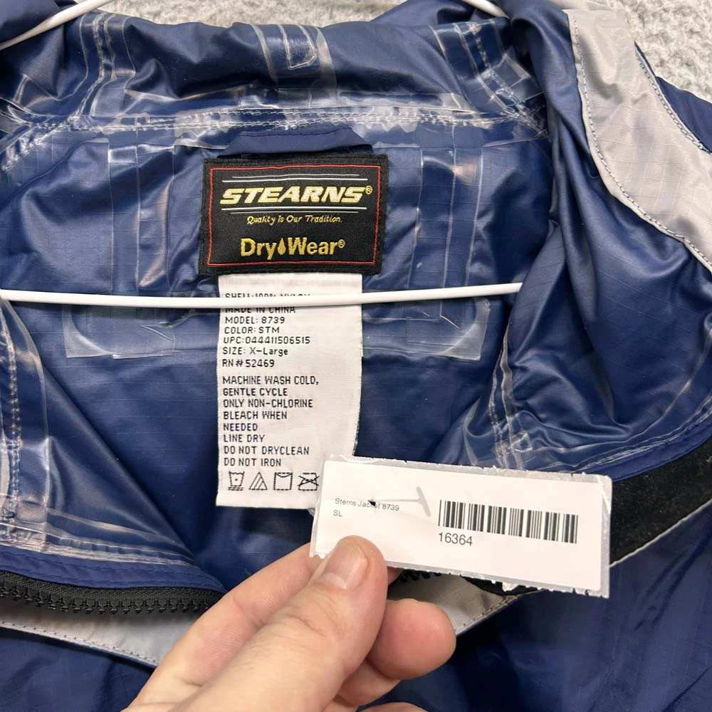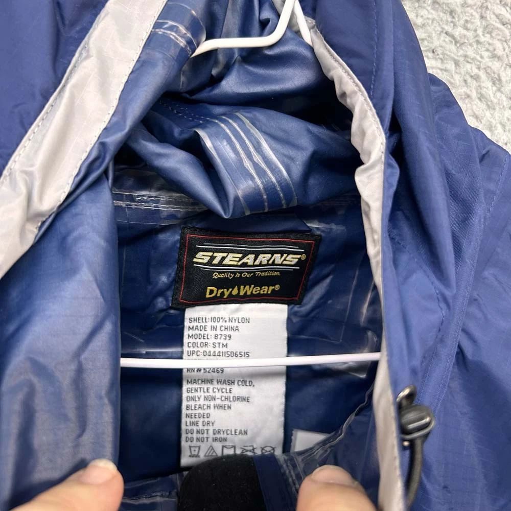 Department: Mens Vintage: No Product Line: 8739 Style: Rain Coat Fabric Type: Woven Size: XL Brand: Sterns Type: Jacket Size Type: Regular Occasion: Casual Garment Care: Machine Washable Pattern: Solid Outer Shell Material: Nylon Closure: Zip Color: Blue