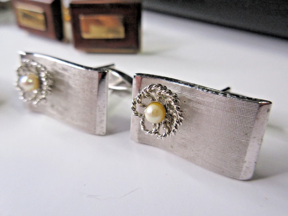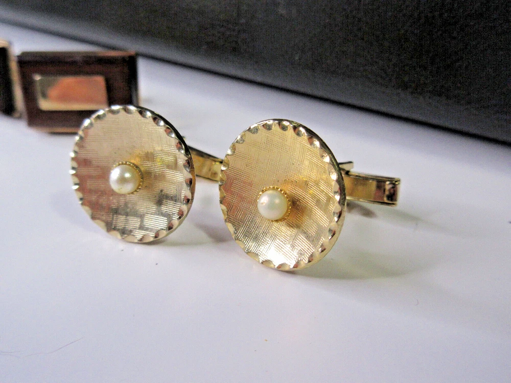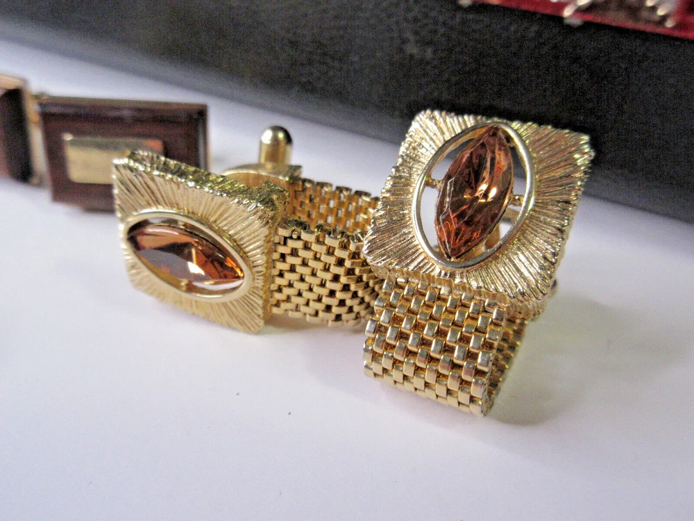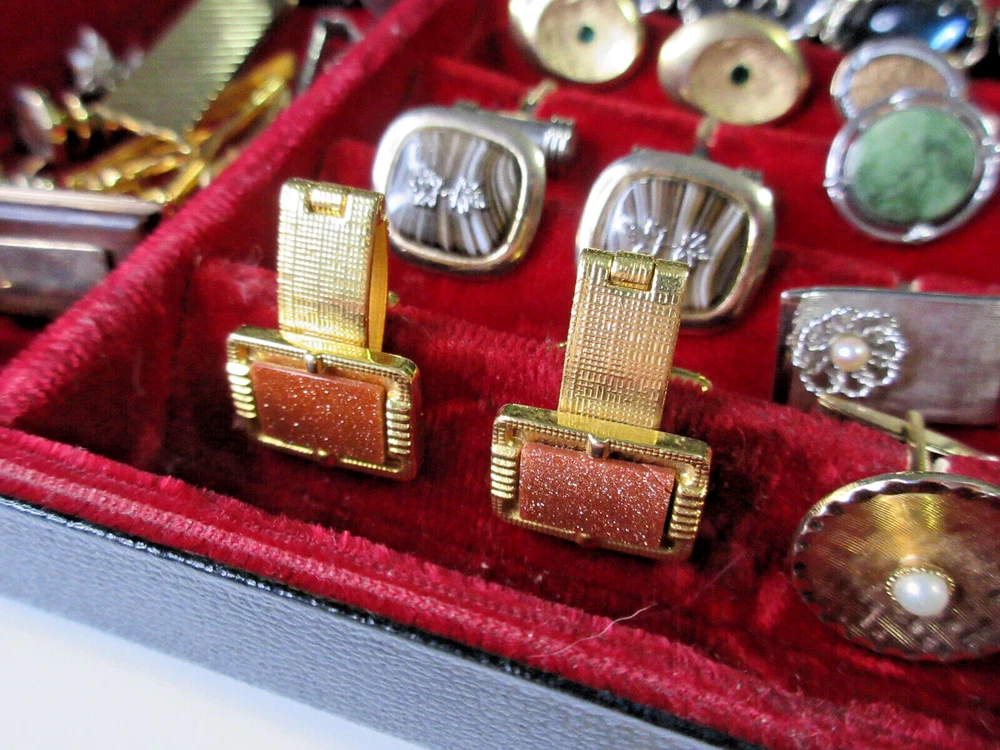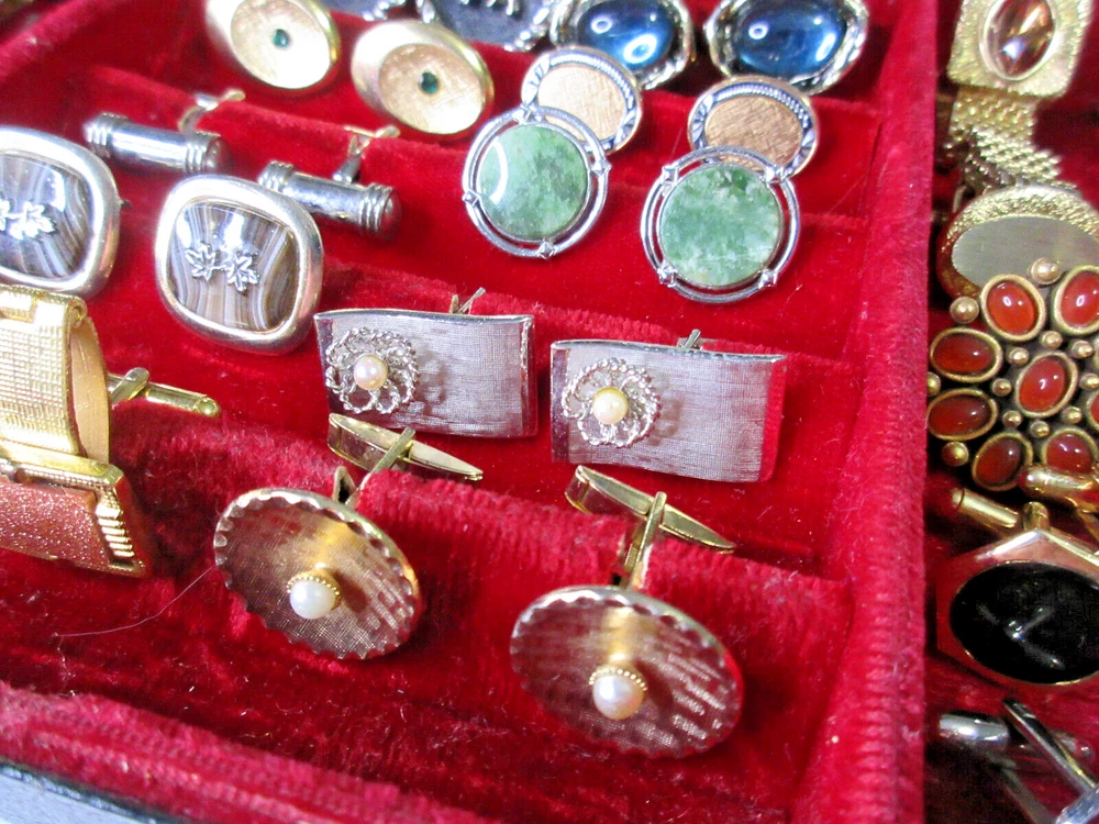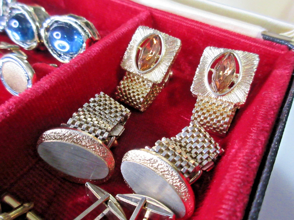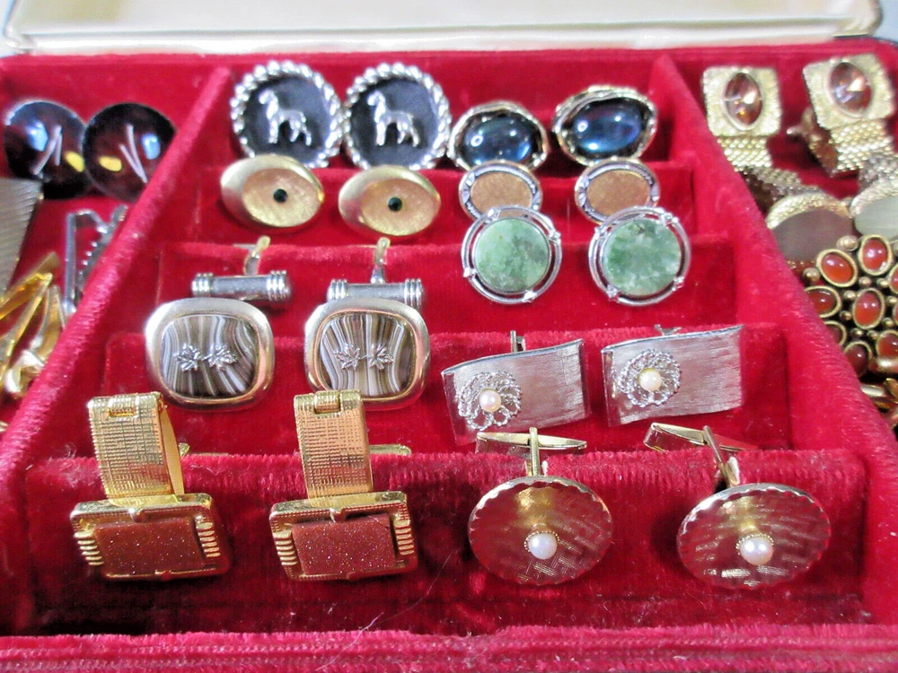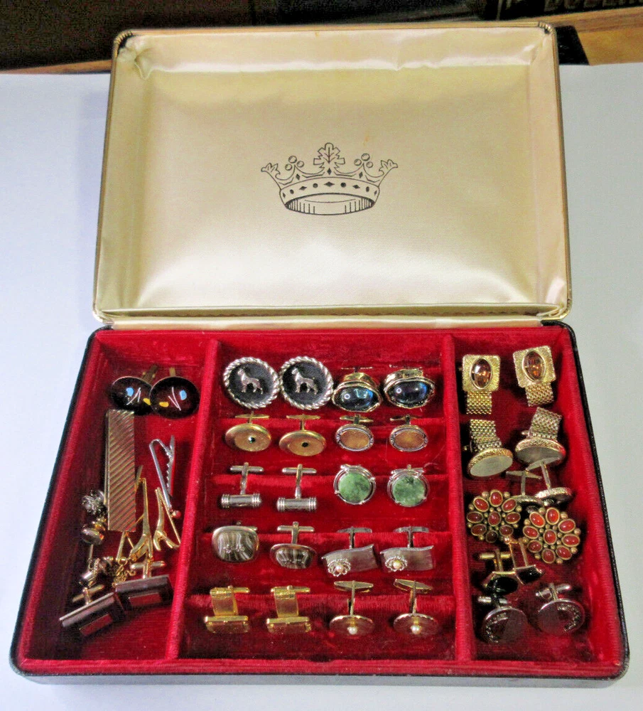 This is a wonderful lot of vintage men's accessories in a vintage Allen brand valet. The lot consists of: 18 pair cufflinks 4 tie bars 3 tie tacs All items will be individually bagged and securely shipped