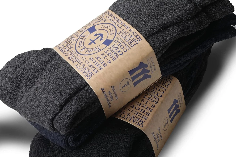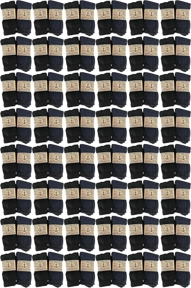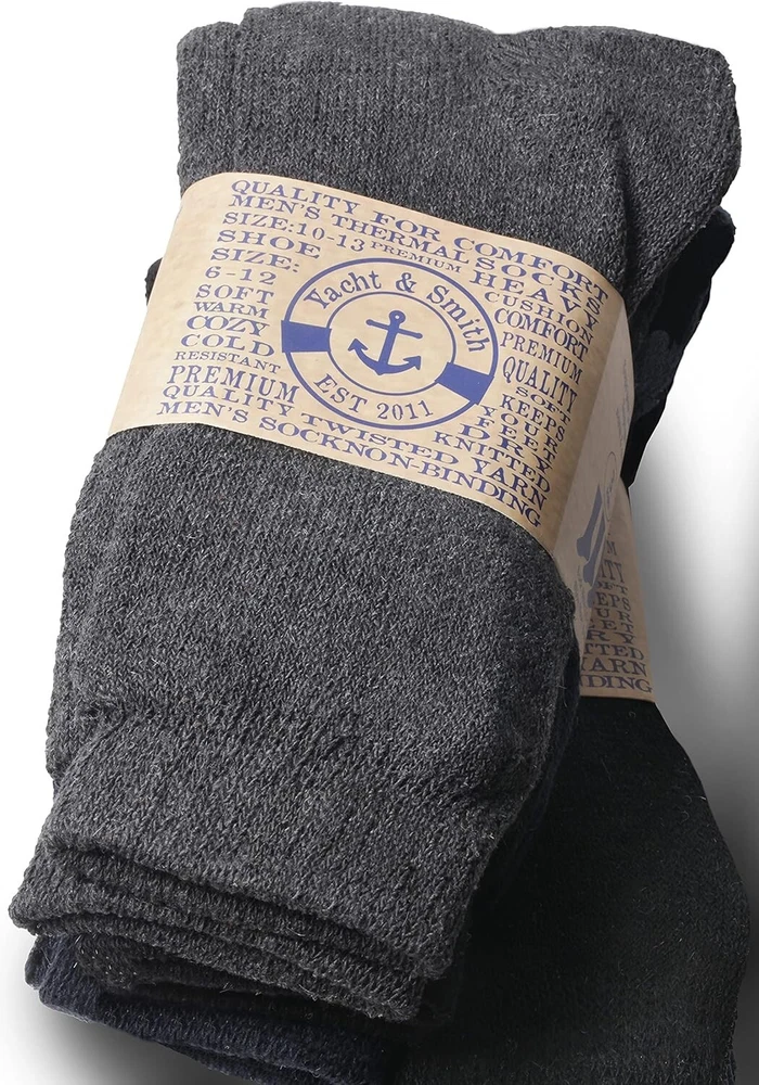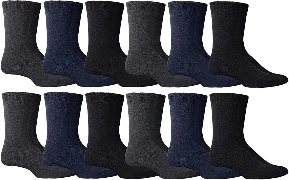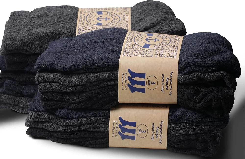 Mens and Womens Thermal Winter Socks, Warm Cold Resistant Bulk Pack 48 PAIRS OF MENS THERMAL SOCKS: The perfect pair to help you get through the winter this season, these thermal socks are thicker than your typical pair of socks . Great for the commute to work, going out with friends, or simply wearing at for wearing with your favorite pair of boots. Ideal for men who love winter sports or work cushioned design offers additional comfort for those long winter days. INSULATED TO RETAIN BODY HEAT: The top band ensures that your sock does not slide down. It also helps to insulate body heat keep and keep the cold air from reaching inside. Keeps body heat close to the body ,ideal for activities including working, skiing, snowboarding, hiking, winter fun. WHOLESALE BULK BUY: Pack sizes available from 12 to 180 Pairs. Enjoy shopping for bulk discounted prices and get more pairs of socks for your money. have a charity in mind ? Consider donating these warm winter socks for a charity of your choice. Dark color warm winter thermal socks is the most essential part of apparel needed to keep warm during the cold winter season. .SOCK DETAILS: Sock size 10-13 will fit men’s shoe sizes 8-12. 70% Acrylic 25% Polyester 5% Spandex Machine wash cold and tumble dry. WHAT MATTERS: Cold resistant, premium quality, soft, non-binding, keeps your feet dry, wicks away moisture, heavy cushion, terry lining. Product details Fabric type 70% Acrylic 25% Polyester 5% Spandex Care instructions Machine Wash Origin Imported Pattern Solid Country of Origin China About this item 48 PAIRS OF MENS THERMAL SOCKS: The perfect pair to help you get through the winter this season, these thermal socks are thicker than your typical pair of socks . Great for the commute to work, going out with friends, or simply wearing at for wearing with your favorite pair of boots. Ideal for men who love winter sports or work cushioned design offers additional comfort for those long winter days. INSULATED TO RETAIN BODY HEAT: The top band ensures that your sock does not slide down. It also helps to insulate body heat keep and keep the cold air from reaching inside. Keeps body heat close to the body ,ideal for activities including working, skiing, snowboarding, hiking, winter fun. WHOLESALE BULK BUY: Pack sizes available from 12 to 180 Pairs. Enjoy shopping for bulk discounted prices and get more pairs of socks for your money. have a charity in mind ? Consider donating these warm winter socks for a charity of your choice. Dark color warm winter thermal socks is the most essential part of apparel needed to keep warm during the cold winter season. .SOCK DETAILS: Sock size 10-13 will fit men’s shoe sizes 8-12. 70% Acrylic 25% Polyester 5% Spandex Machine wash cold and tumble dry. WHAT MATTERS: Cold resistant, premium quality, soft, non-binding, keeps your feet dry, wicks away moisture, heavy cushion, terry lining. See more About this item