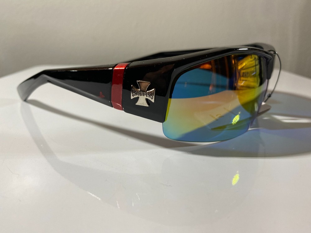 Men's popular riding sunglasses with black frame and yellow reflective lenses. Great price.