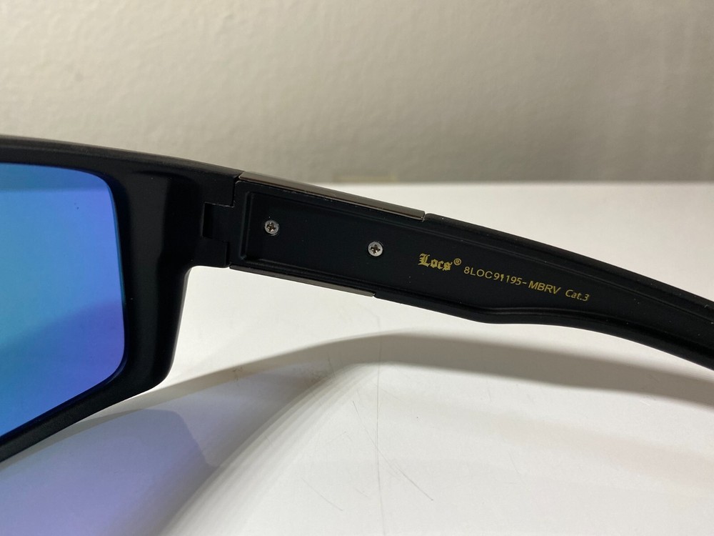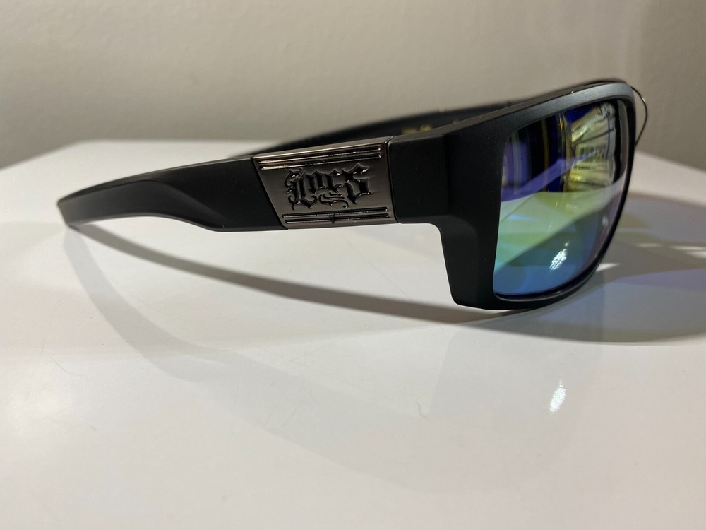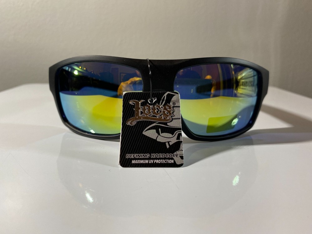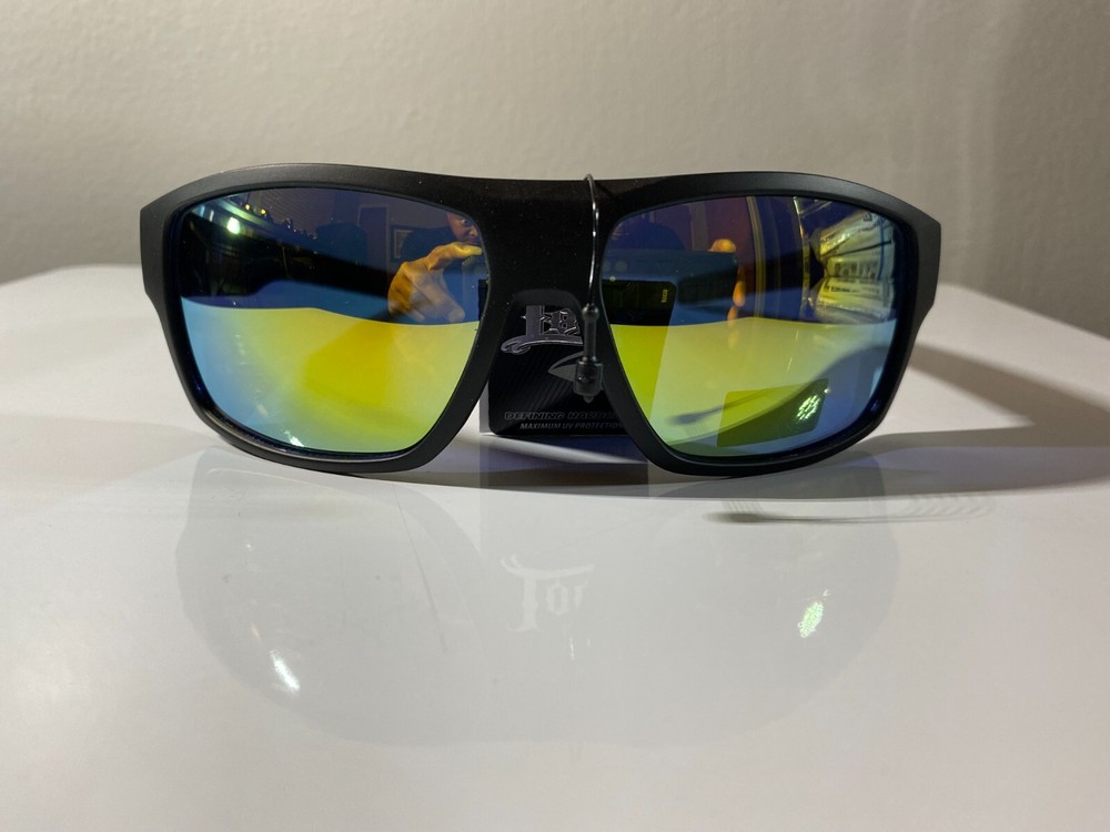 Men's wrap around sunglasses with black frame and yellow reflective lenses. Great price.