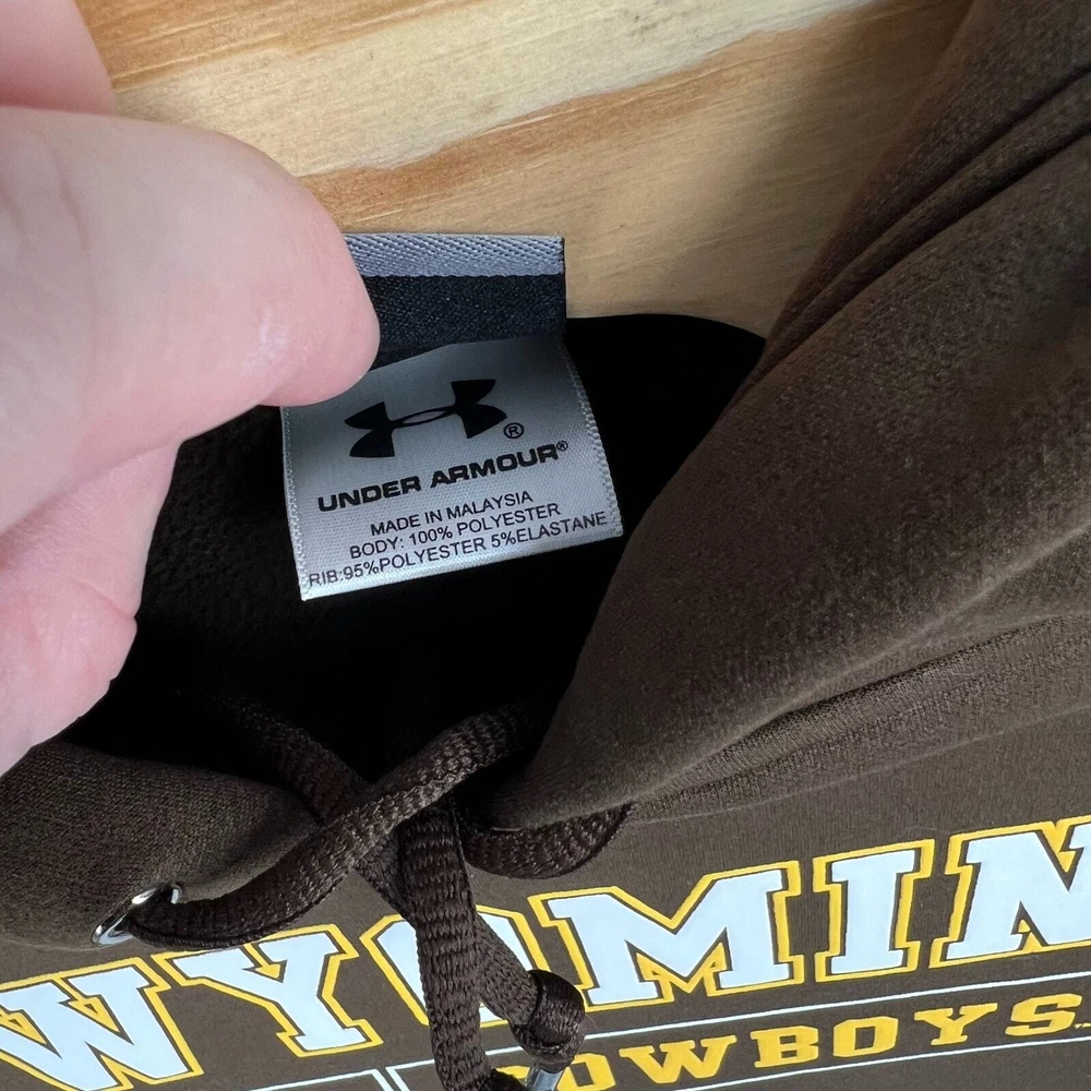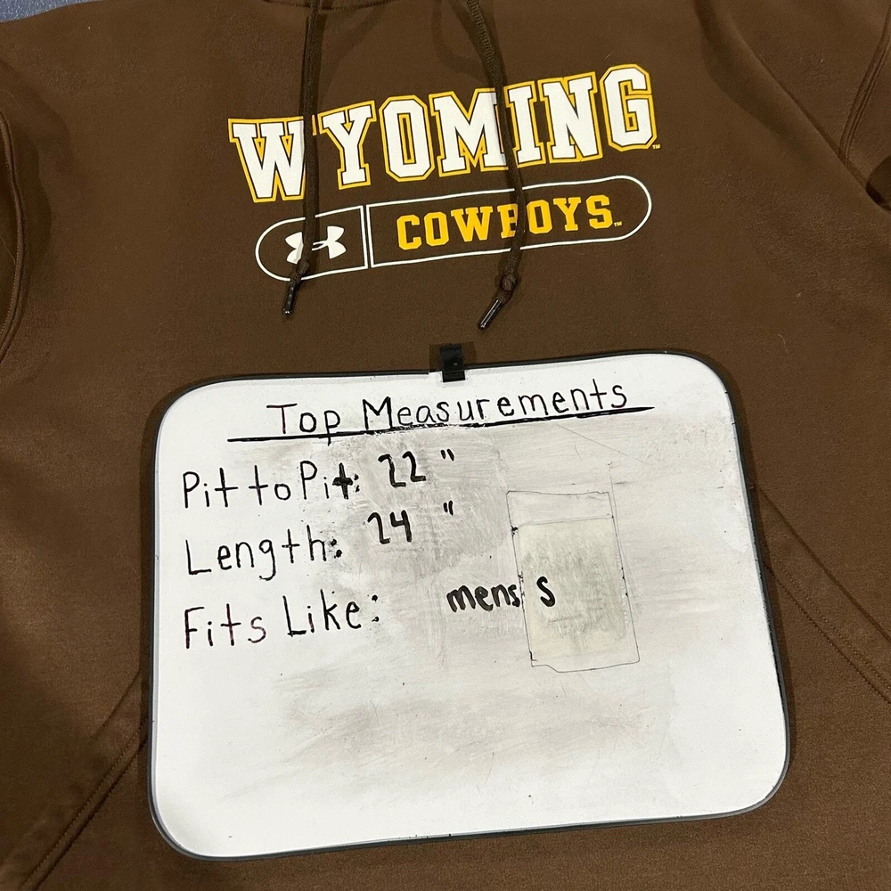 Men's brown Under Armour University of Wyoming Cowboys hoodie sweatshirt pit to pit: 22" length: 24" Fit's like: men's S Item is in good used condition. Look at photos to see the condition. All, if any, flaws have been pictured. See the last photo for measurements along with my suggestion of what it fits like. Please know which measurements fit you prior to purchasing, and don’t just rely on my suggestion. Feel free to ask any questions! ***Item is cross posted on several platforms***