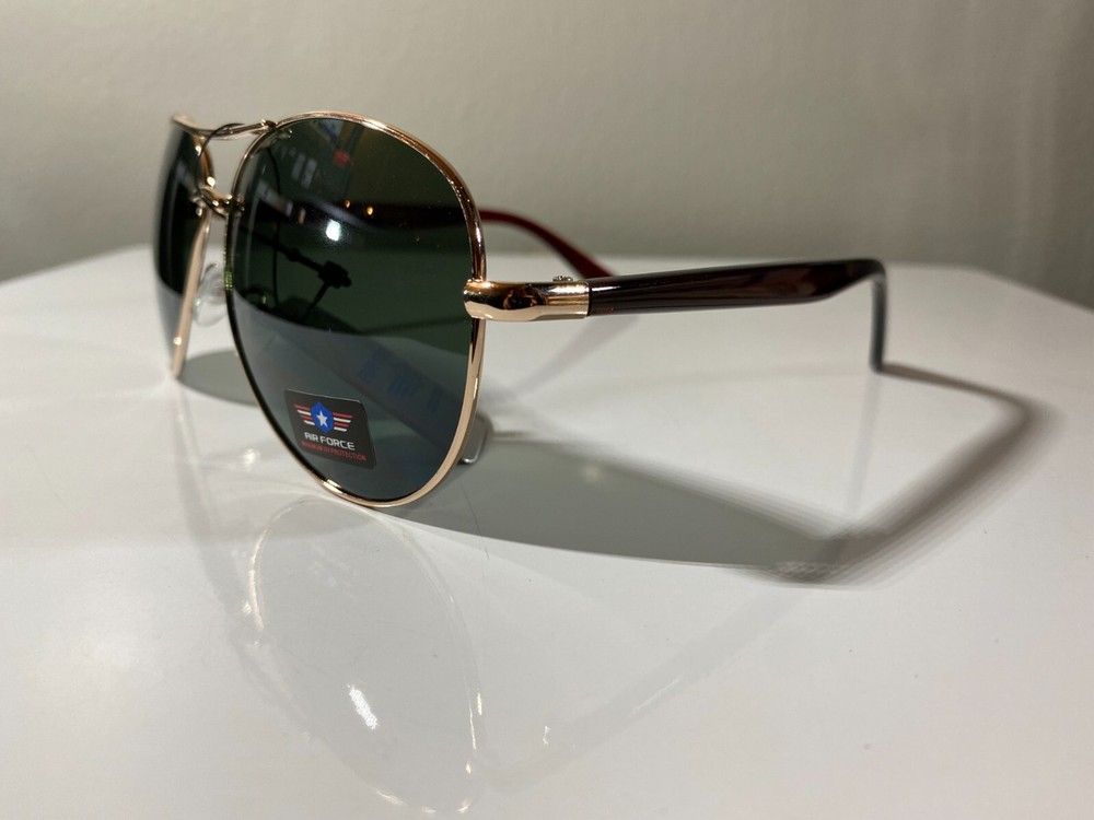 Men's aviator style sunglasses with gold wire frame and green lenses. Great price.