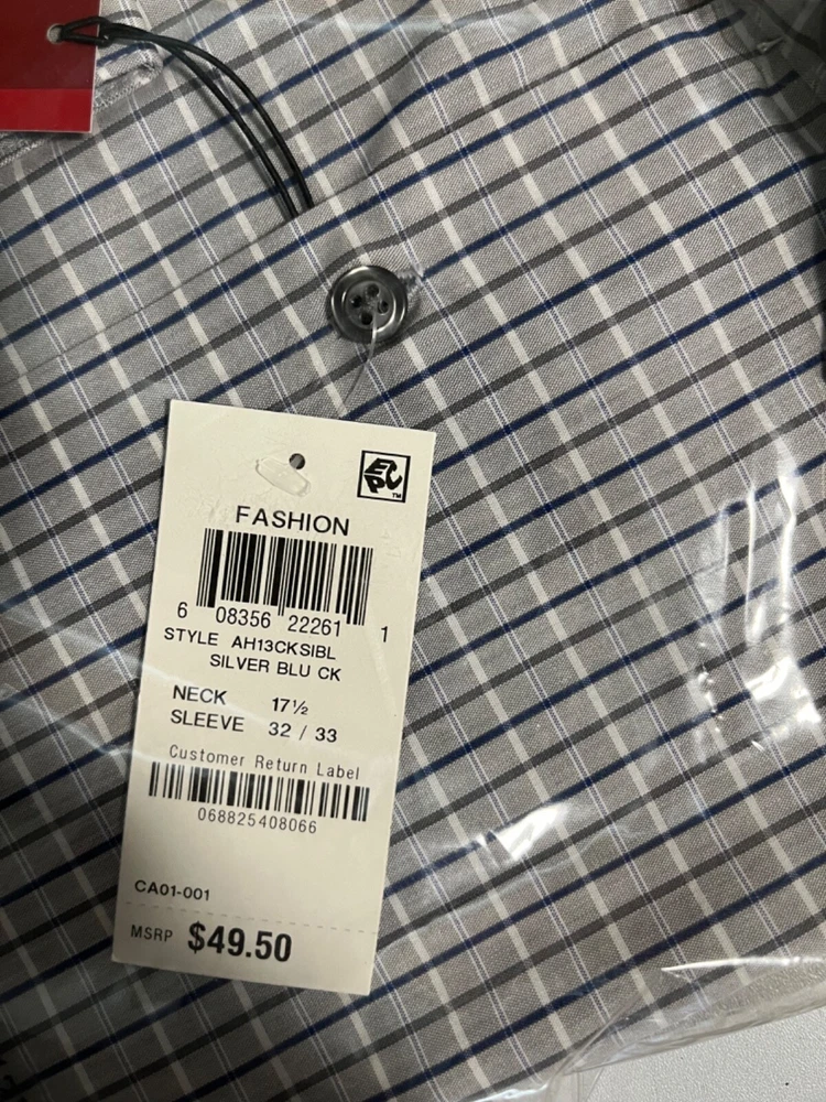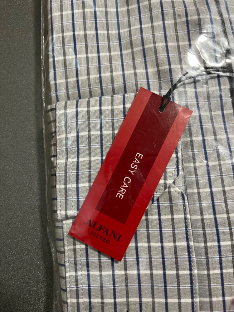 This product is a men's dress shirt by the brand Alfani in a size 17.5 neck with a 32/33 sleeve length. The shirt is a light grey-blue color and features long sleeves. It is a regular size type and is designed for men's formal wear.