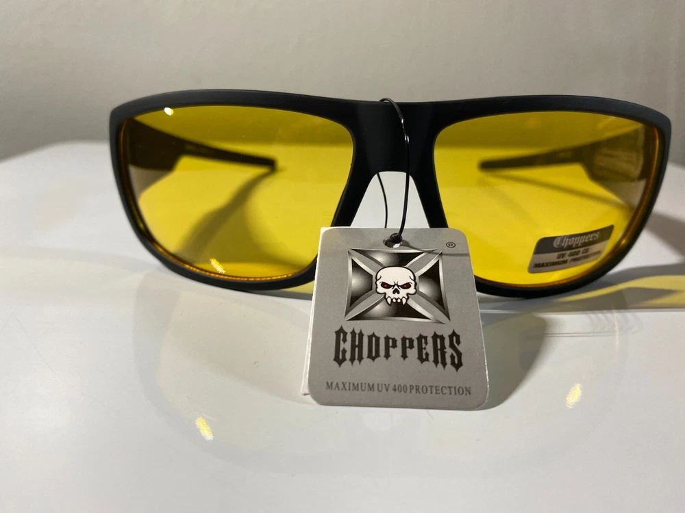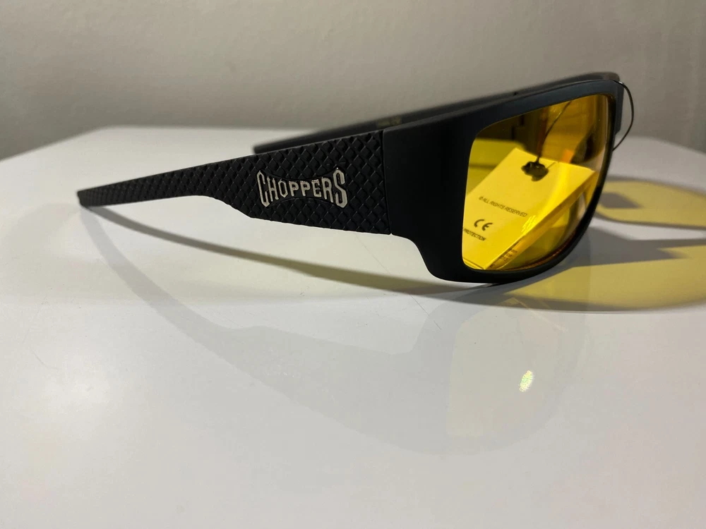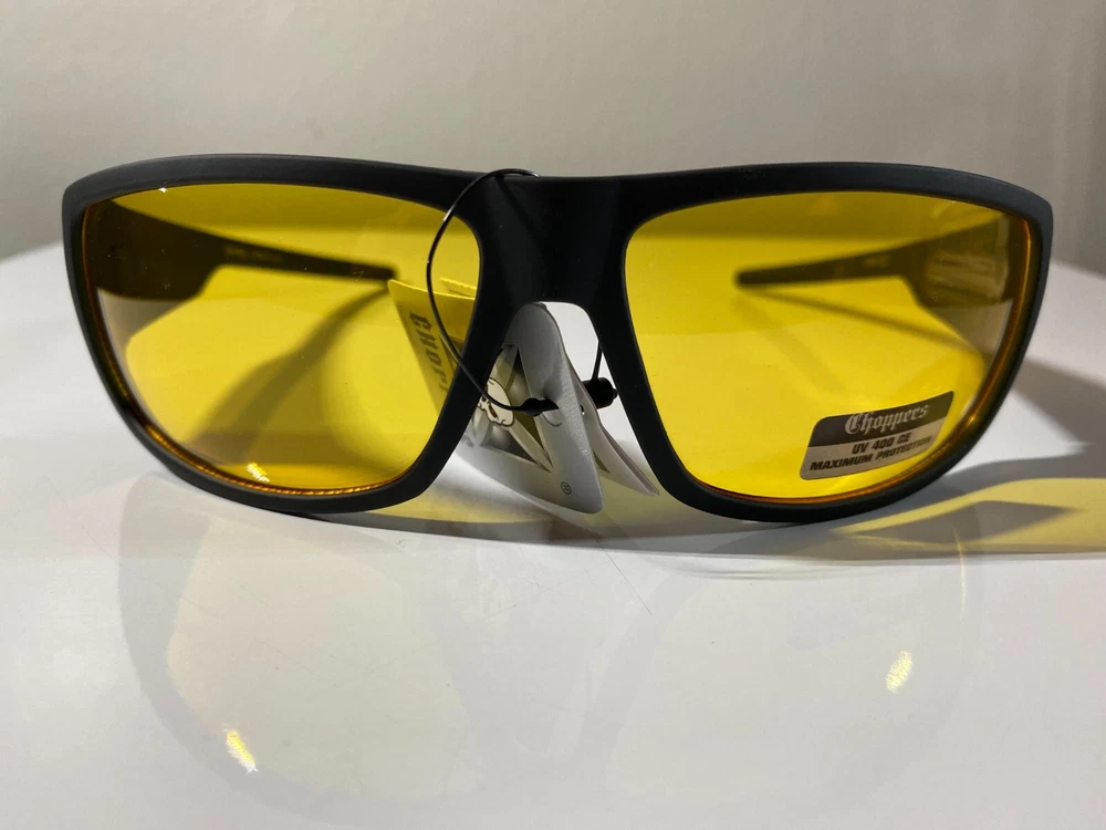 Men's popular riding sunglasses with black frame and yellow reflective lenses. Great price.