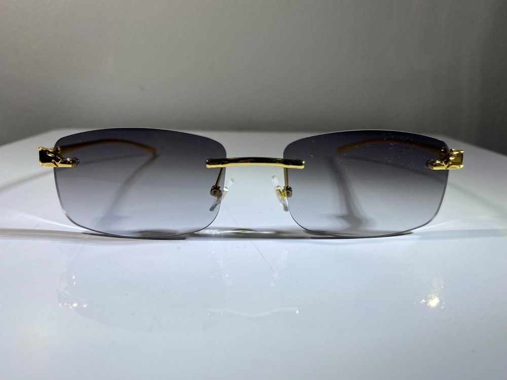 Men's rimless, rectangular sunglasses with gold wire frame and smoke lenses. Great style at great price.