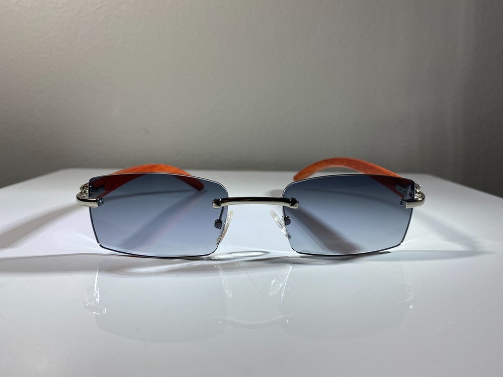Men's rimless sunglasses with wood grain frame, silver accents & smoke lenses. Classic style at great price.