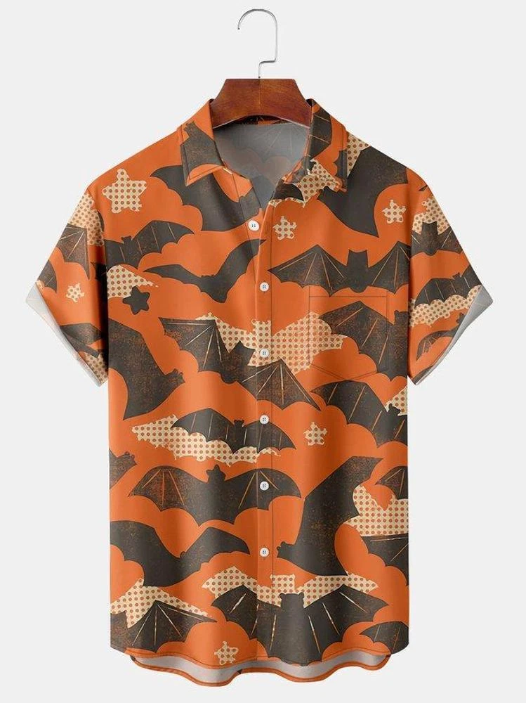 Menx27s Halloween Bat Print Short Sleeve Hawaiian Shirt With Chest Pocket
