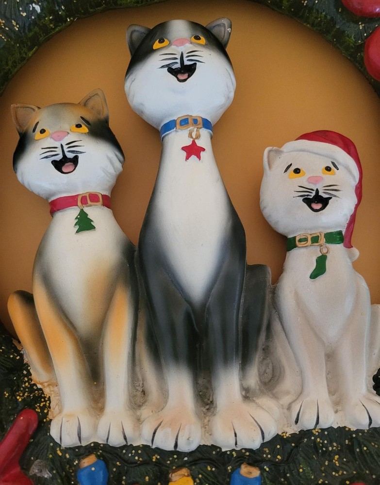 Meowy Christmas Wreath adorned with candy canes, lights and ornaments. Christmas song is from the San Francisco Music Box Co. The song is instrumental, cats do not sing. 12" across Takes 3 AA Batteries not included
