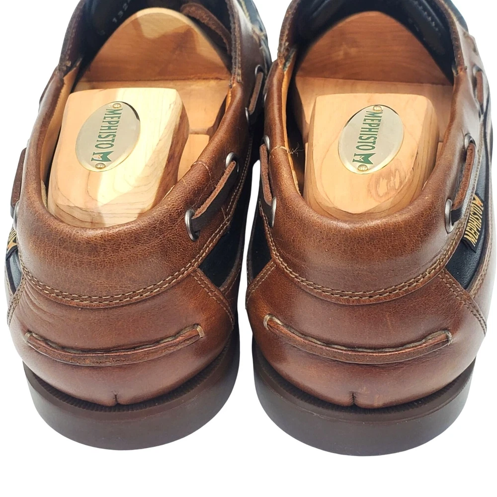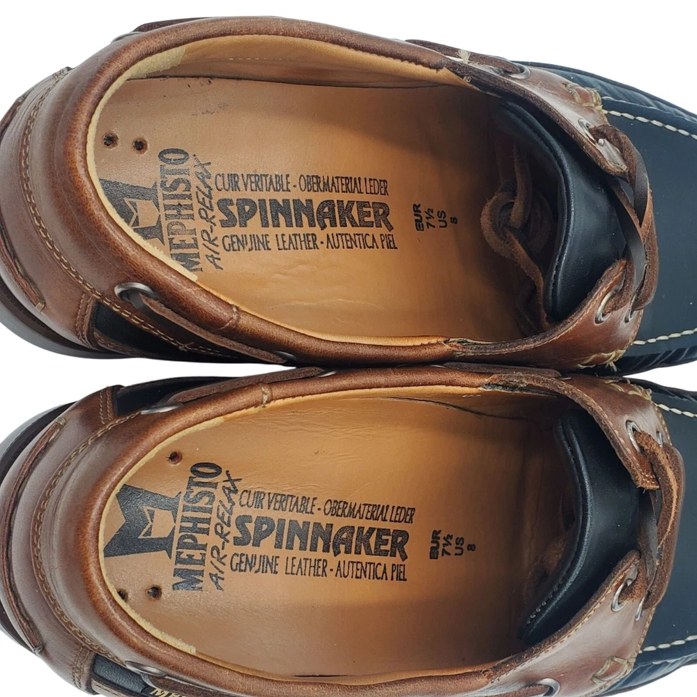 Mephisto Model: Spinnaker Crafted In Croatia Original MSRP: $275 Color: Black Brown US Men's size: 8 Standard width Bottom Sole Measurements (approx) Heel to Toe: 11.5 in Widest Spot: 4 in ==Honest Condition Report== Uppers: 9/10 Light wear creasing, scuffs Linings: 9/10 Outsoles: 9/10 Light wear to soles even wear to heels BOATING model by MEPHISTO : Comfortable and easy to slip on, this boat-style model is an essential for sunny days. Its leather lining promotes a healthy climate inside the shoe. This men's black boat shoe is made of two nuances of greased pull-up effect leathers. Trusted Seller with near perfect feedback! Shoe trees and other props are for display only unless otherwise mentioned in item description/title Discount, value, clearance, sale, cheap, deal, deals, sales, coupon, price, Features: • Loafer Size: Mens 8 Condition: Pre-Owned Good Please see item description for full Honest Condition Report