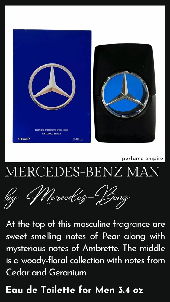 Home Perfume for Her Perfume for Him Unisex Testers for Her Testers for Him Kids MENU Store Pages Home View All Listings About Us Shipping Orders and Returns FAQ Contact Us Store Categories Perfume for Her Perfume for Him Unisex Testers for Her Testers for Him Kids Mercedes-Benz Man by Mercedes-Benz EDT (Eau De Toilette) 3.3 / 3.4 oz (100ml) New In Box At the top of this masculine fragrance are sweet smelling notes of Pear along with mysterious notes of Ambrette. The middle is a woody-floral collection with notes from Cedar and Geranium. BRAND: Mercedes-Benz FRAGRANCE NAME: Mercedes-Benz Man SIZE: 3.4 fl oz CONCENTRATION: Eau de Toilette FORM: Spray CONDITION: New GENDER: Men PACKAGE TYPE: New Retail Box Package Type - RETAIL BOX? This item comes in brand new manufacturer retail packaging, same as what is found in a retail store. unused, unopened, undamaged item. SHIPPING We ship all orders the same day or next business day. Once an order is shipped, we will email you a tracking number. We ship to all USA states including Puerto Rico, Hawaii, Alaska, APO/FPO/DPO and selected international destinations. (Please check shipping and handling tab for country specific details) Please make sure you enter the correct shipping address at the checkout. We will not make any changes to the shipping address once you place the order. If any shipment is returned due to an error in the shipping address provided to us or due to package not being claimed by the receiver, we will deduct $6.99 from the purchase price prior to issuing the refund. RETURNS We stand behind every product we sell. If you're not pleased with your purchase, we'll be happy to make an exchange or a refund of the product price less Shipping & handling within 30 days of receipt of your purchase. For any exchange or refund, we need the original receipt or a record of the purchase in our system, and the product must be in its original condition, including the box, UPC bar code, packaging, and all accessories. Please contact us before returning an item to get a RMA number. Any return without a RMA number will not be accepted or processed. All returns should be accompanied with a tracking or delivery confirmation number back to our warehouse. Shipping and handling charges are non refundable. A 20% restocking fee will be applied to all returns. Due to health precautions, we cannot accept returns on Skincare and Hair care products. Please allow up to 10 business days for returns to be processed.