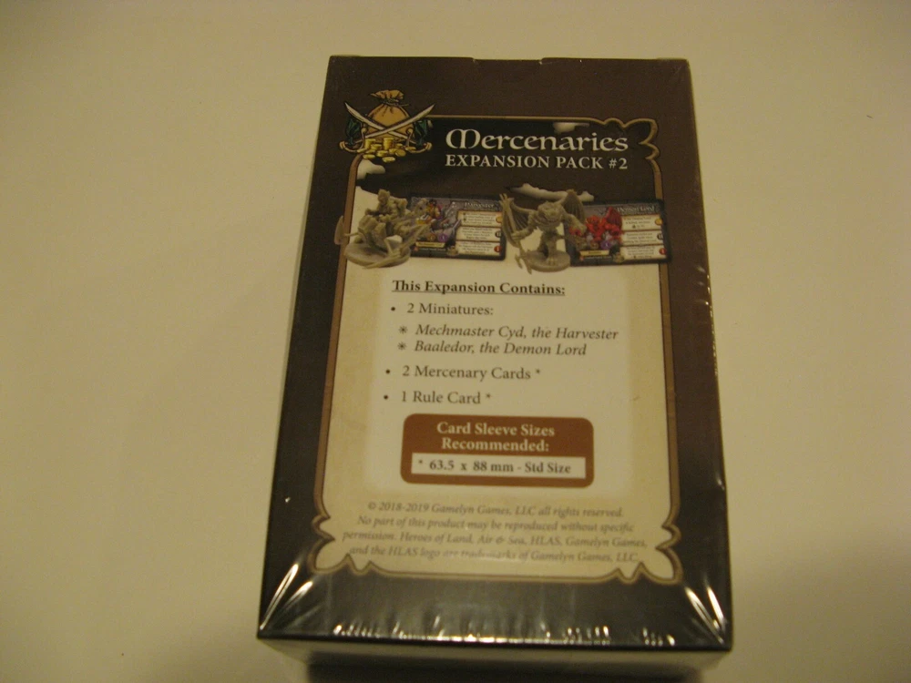 Here are the three Mercenaries Expansion Packs (Gamelyn Games, 2018-2019) for Heroes of Land, Air & Sea , the 4x board game where players compete to expand their small kingdom into a major power. #1 (HLASP202) includes 4 mercenary miniatures with cards; #2 (HLASP302) includes 2 miniatures with cards; and #3 (HLASP401) includes 4 miniatures with cards. All are new and sealed in shrink wrap. Shipping cost will be determined by the shipping calculator . And I will combine shipping whenever possible to make it as economical as I can for you. So please check my other listings! Thanks for looking!