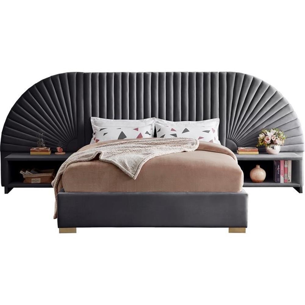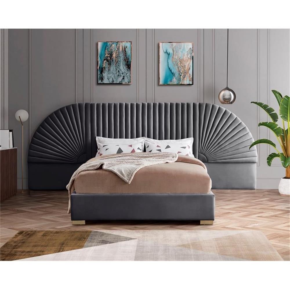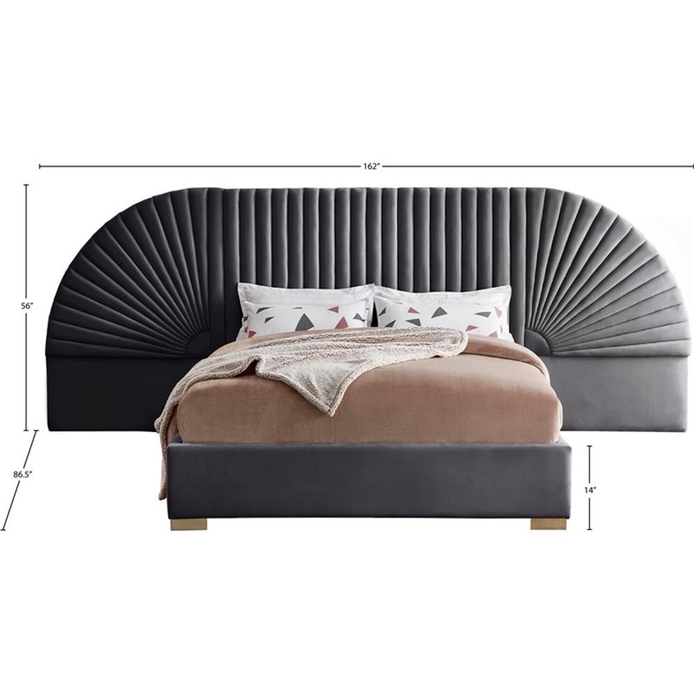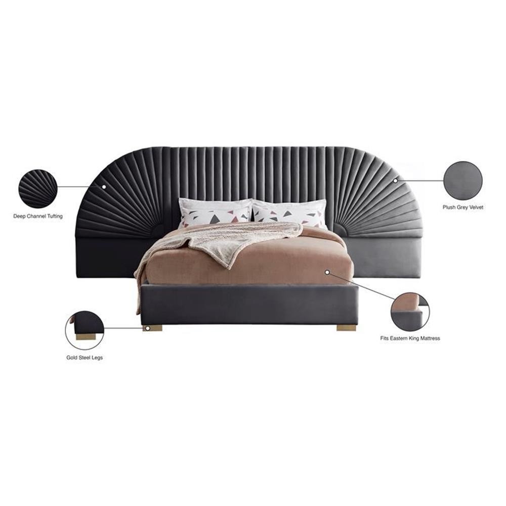 Enjoy sweet dreams in this beautiful Cleo grey velvet king size bed. The tall, luxurious velvet headboard is upholstered in a channel-tufted style, flanked by removable fan-shaped side pieces. The footboard and rails are comfortably upholstered in soft grey velvet as well, with gold steel legs supporting the frame. Matching pieces are available in the same collection, allowing you to complete the contemporary style of this look for an elegantly glamorous bedroom. Features: Soft Grey Velvet Gold Steel Legs Removable Panels Headboard Height: 56" / Footboard Height: 14" / Sideboard Height: 14" Leg Height: 2" Fits Eastern King Mattress Height From Floor to Top of Slats: 12.6" H Specifications: Product Dimensions: 162" W x 86.5" D x 55.5" H Headboard Dimensions: 162" W x 4" D x 55.5" H Footboard Dimensions: 82" W x 2.75" D x 14" H Color/Finish: Gold Weight Capacity: 850 Assembly Required: Yes