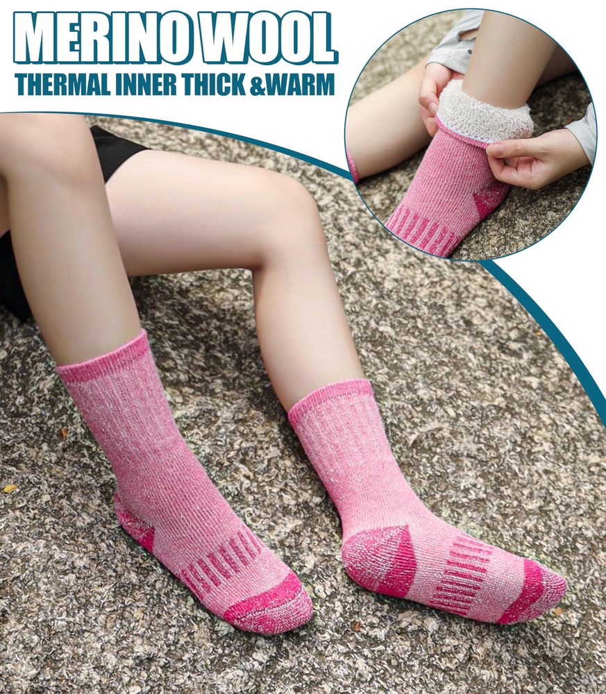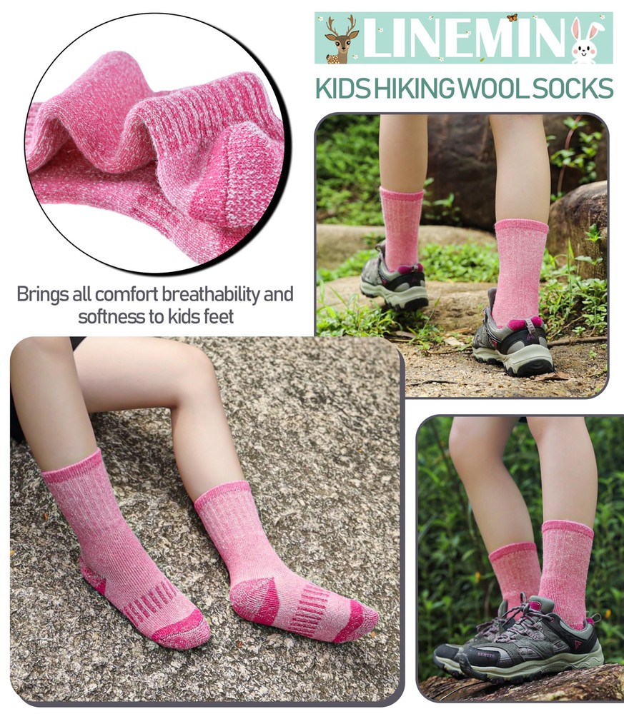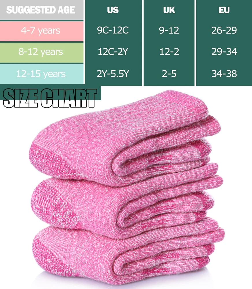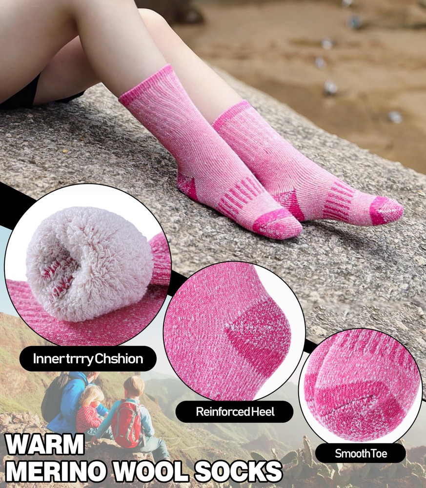 High Quality : The hiking socks is blend of premium merino wool.are made of 70% Merino Wool, 23% Polyester, 5% Spandex, 2% Nylon.These socks are soft comfortable, lightweight, wearable and sweat-wicking. Size : There are 3 sizes to choose, 4-7 years, 8-12 years,12-15 years . They are suitable for hiking , running ,skiing , gym class ,playing outdoor or other activities. PACKAGE INCLUDED : This package includes 3 pairs of merino wool ski socks designed specifically for boys girls.These boot socks have high stretchy cuff and arch support, keeping socks stable, improving blood circulation and reduce plantar fasciitis.  HIGH PERFORMANCE : Socks have thick loops on the toes, soles and heel to provide cushioning.The reinforced heel can prevent blister and the thicken toe does not grind kid’s feet, the thermal inner can keep feet warmer and more comfortable.They are great hiking socks for boys girls. PERFECT GIFTS FOR : The winter wool socks are perfect gifts for boys, girls, teenagers, they can be birthday gifts, children's gifts, Christmas gifts, etc.