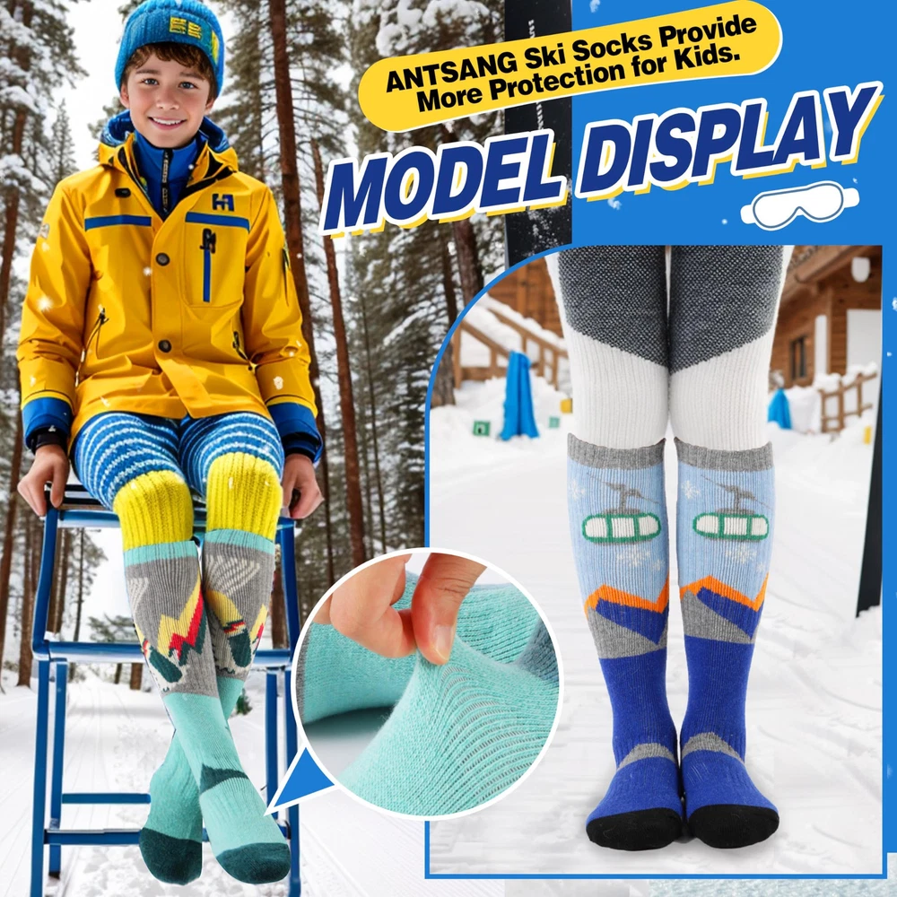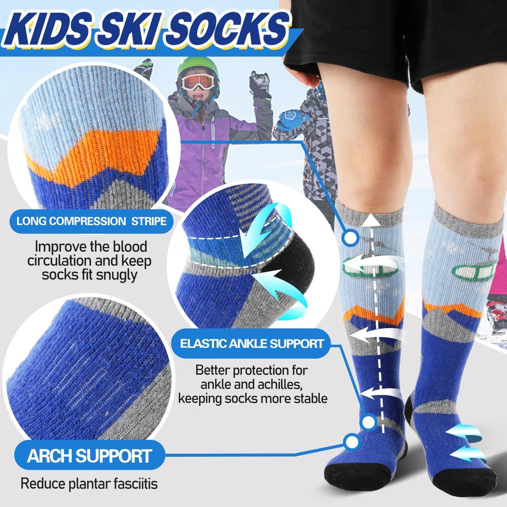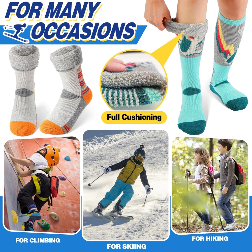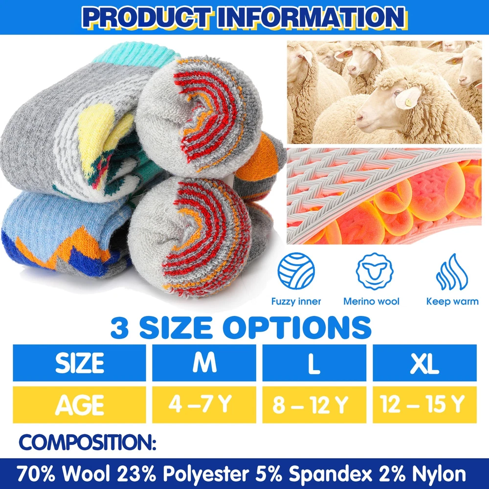 MOISTURE CONTROL FABRIC: Made of 70% MERINO WOOL, 23% POLYESTER, 5% SPANDEX , 2% NYLON.The material of these wool ski socks are wear-resistant , durable , and temperature regulation.These thick socks for feature an excellent moisture control function, keeping feet dry and breathable at all times. SIZE & COLOR : The merino wool ski socks are available in three different sizes: 4-7 years, 8-12 years, and 12-15 years. The color selection of these thermal snow socks is fashionable, making them a favorite among young skiers. PROTECTION FOR FEET : High stretchy fabric keeps socks fit snugly and prevents slipping.Full cushioning has better shock absorption, which can reduces the foot soreness and provides more protection for Achilles.Engineered heel and seamless toe do not grind feet and avoid blisters , providing the most comprehensive protection for kid's feet. PACKAGE INCLUDED : This package includes 3 pairs of merino wool ski socks designed specifically for boys girls. These knee high socks are suitable for various activities such as skiing, snowboarding, skating, hiking, running and outdoor play. GREAT GIFT CHOICE : wool ski socks are best present options for girls boys . They will be a surprise for as birthday gift, Christmas gift, Children’s Day gift,or other holiday gifts!