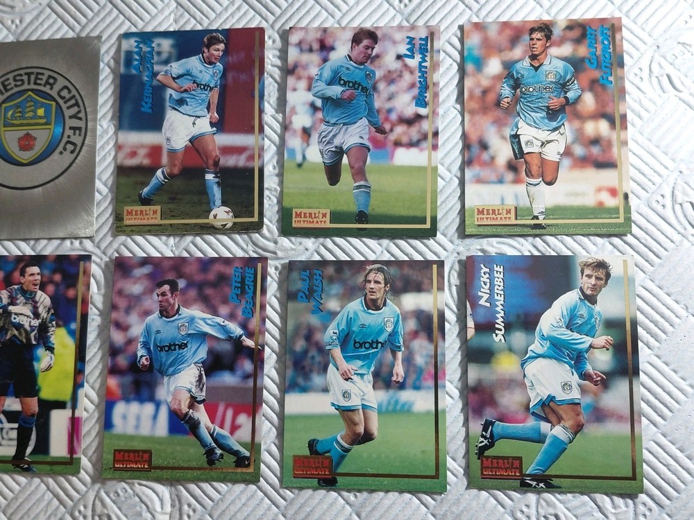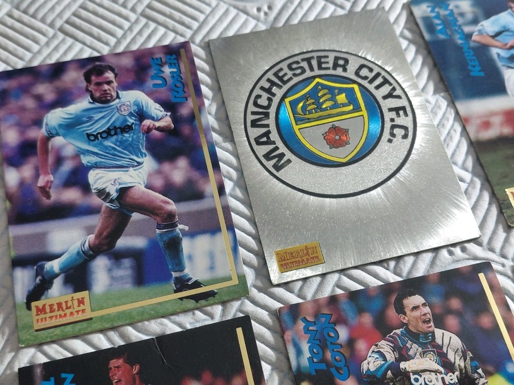 Merlin 1995 Premier league Badge collection cards Manchester City Bundle 10 cards left to right Uwe Rosler City Badge Shiny Alan Kernaghan Ian Brightwell Gary Flitcroft Nails Quinn Tony Coton Peter Beagrie Paul Walsh Nicky Summerbee All fantastic condition not graded. No refunds