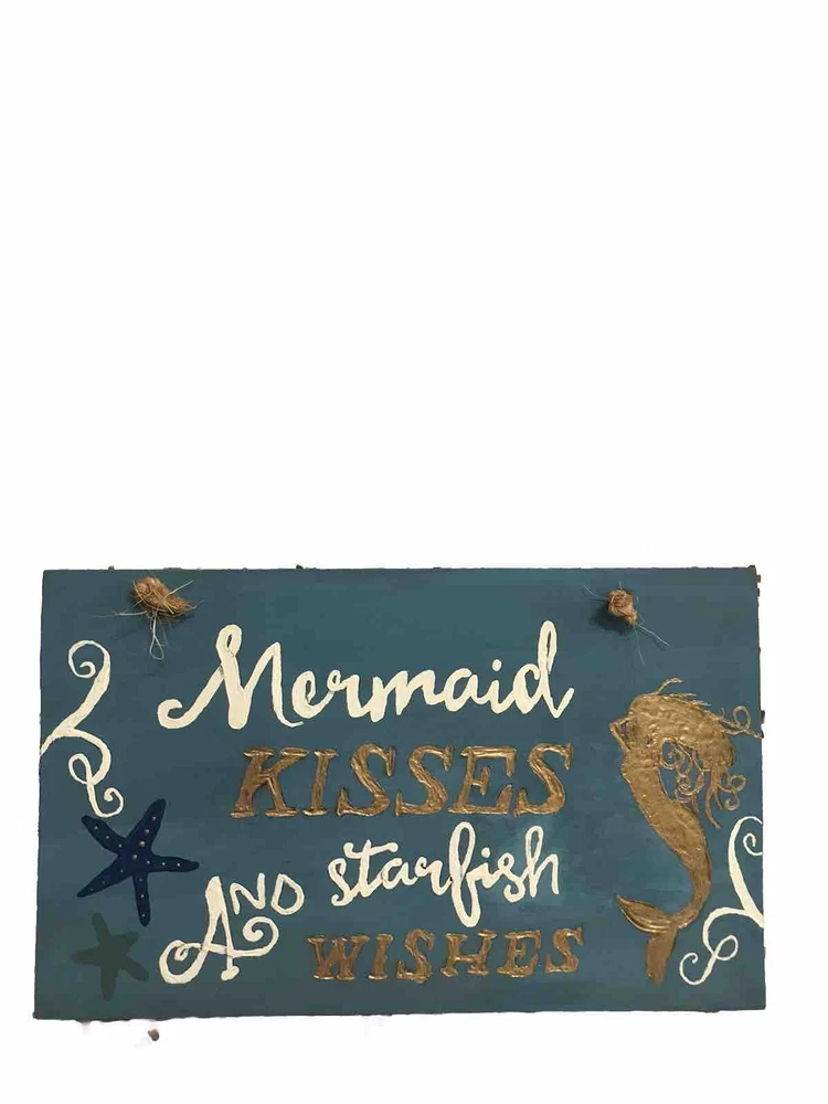 Add a touch of oceanic charm to your living space with this handcrafted wood sign featuring a mermaid and starfish design. The medium-sized sign measures 9 inches in length and 5.5 inches in width, making it the perfect addition to any beach or nautical themed room. The blue color of the sign complements the oceanic theme and the wooden material adds a rustic touch to the overall look. This sign is perfect for anyone who loves mermaids and oceanic adventure. The sign is handmade, making it a unique piece that you won't find anywhere else. It's a great addition to any collection or as a standalone statement piece.