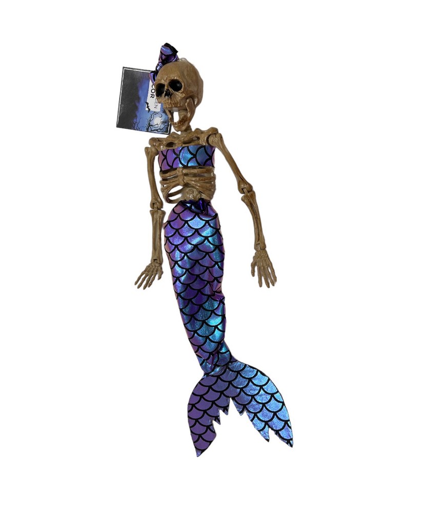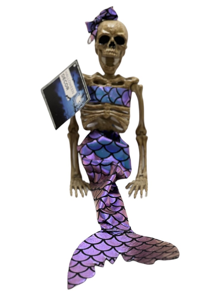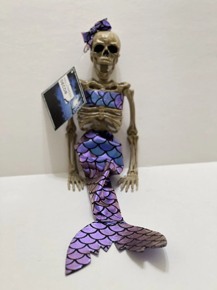 16” Mermaid Skeleton Dressed Hanging Decor Halloween Prop Flexible Articulated Joints and lower jaw can be positioned to open or closed. Hang in Any room with the hanger that is attached New with tag attached. Has not been displayed in the past. Picture with can is for size comparison only and the can is not included.